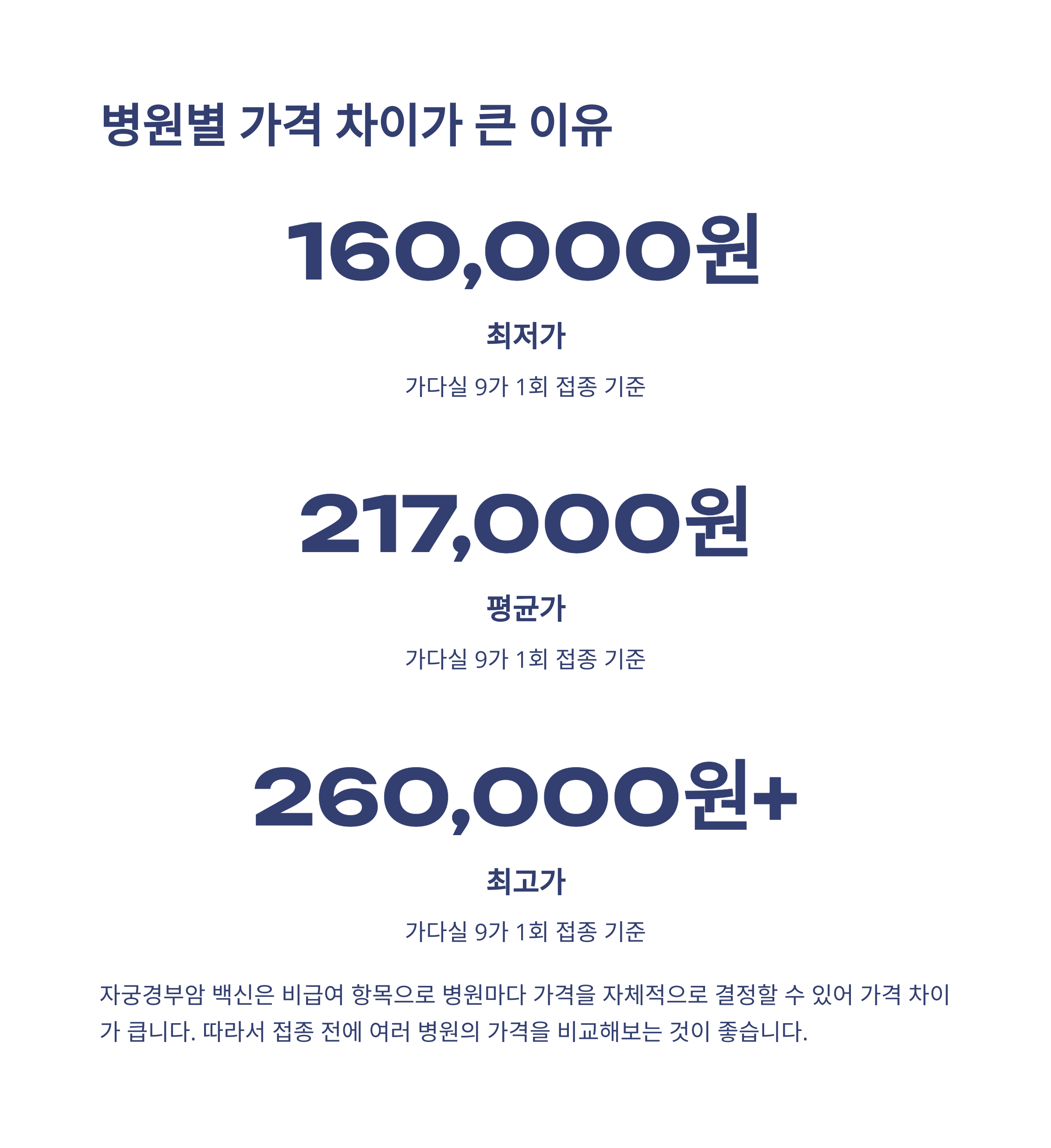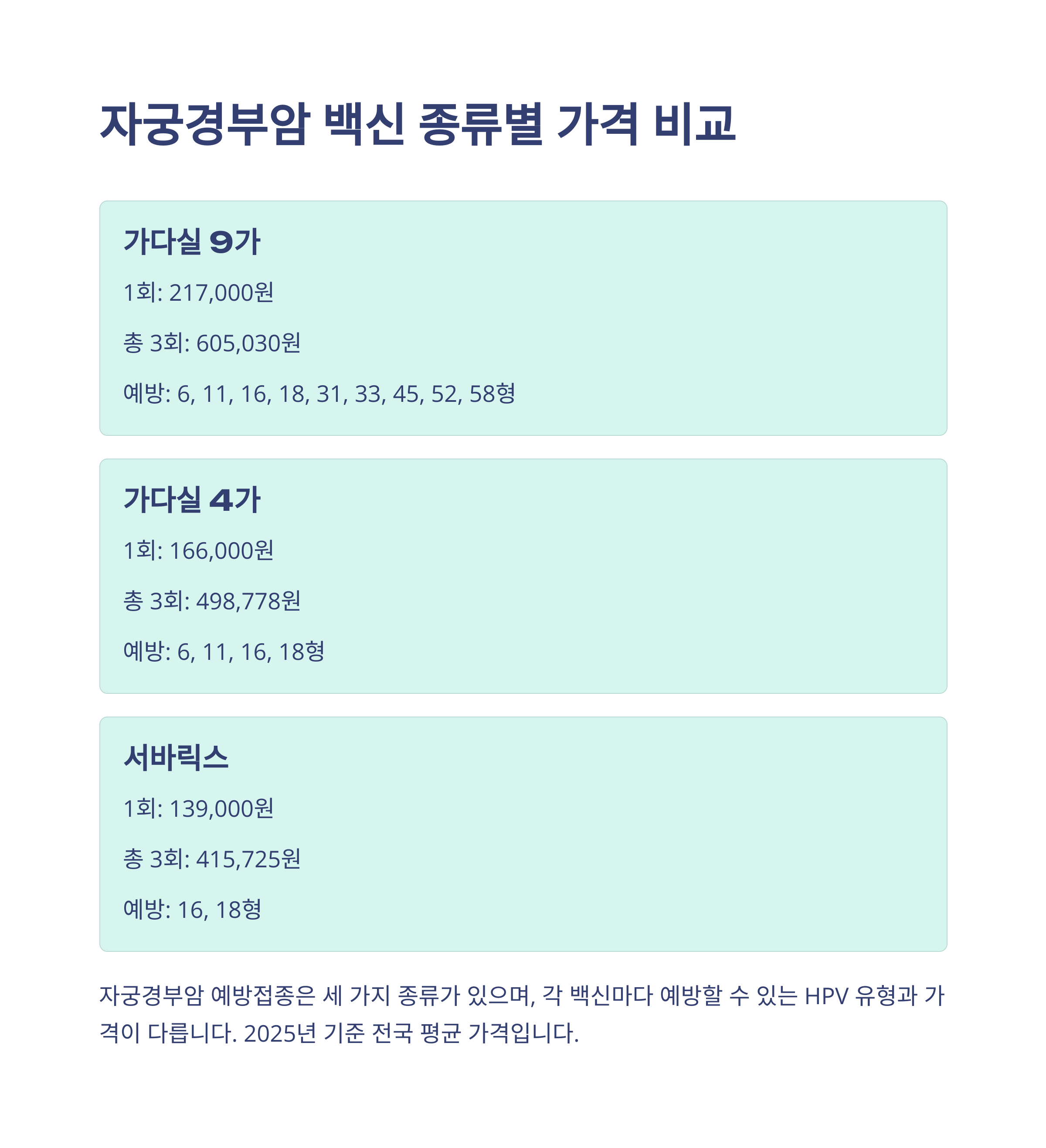 | 백신 종류 | 1회 접종 평균가 | 3회 접종 총비용 | 예방 HPV 유형 |