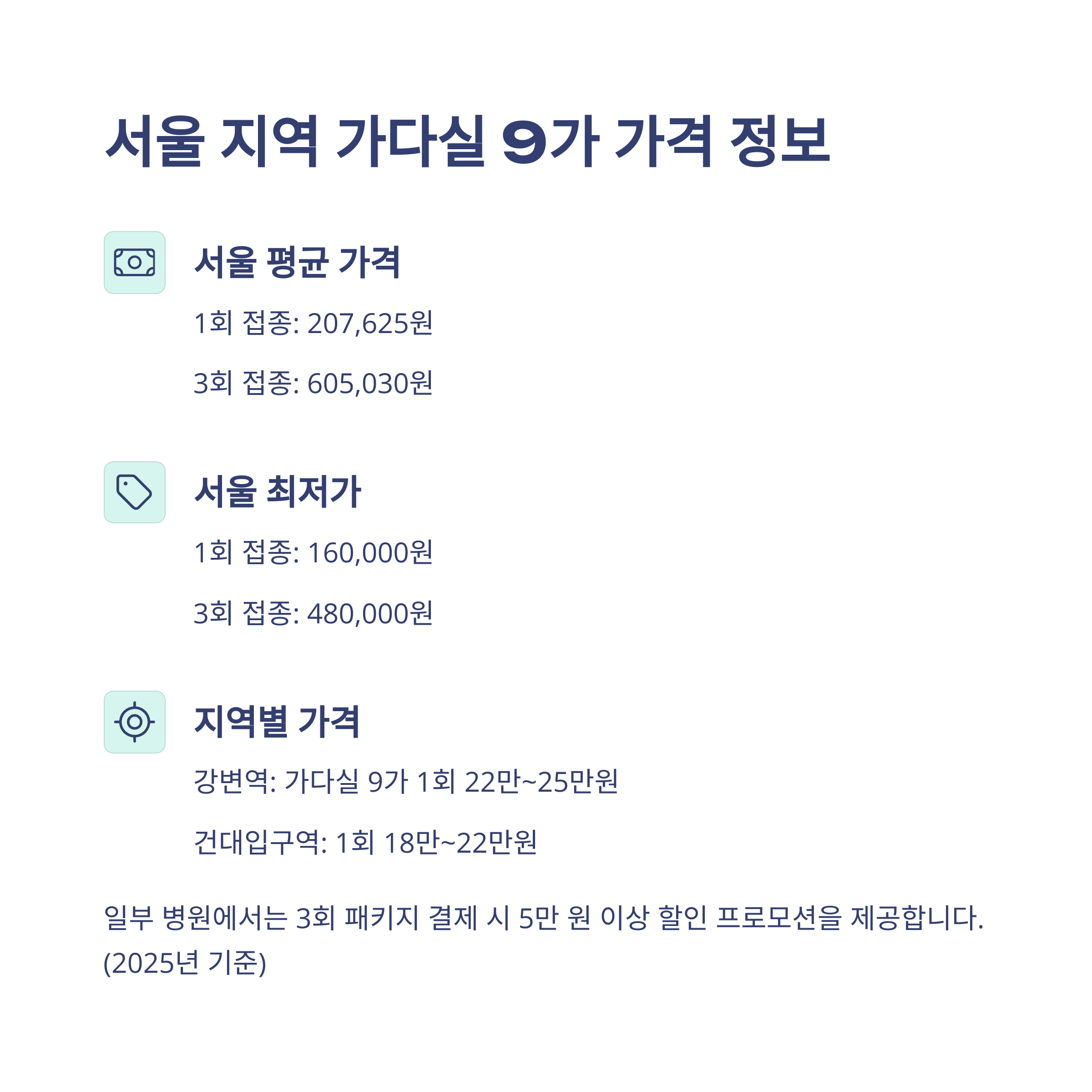 - 서울 평균가 (가다실 9가): 1회 207,625원, 3회 평균 605,030원