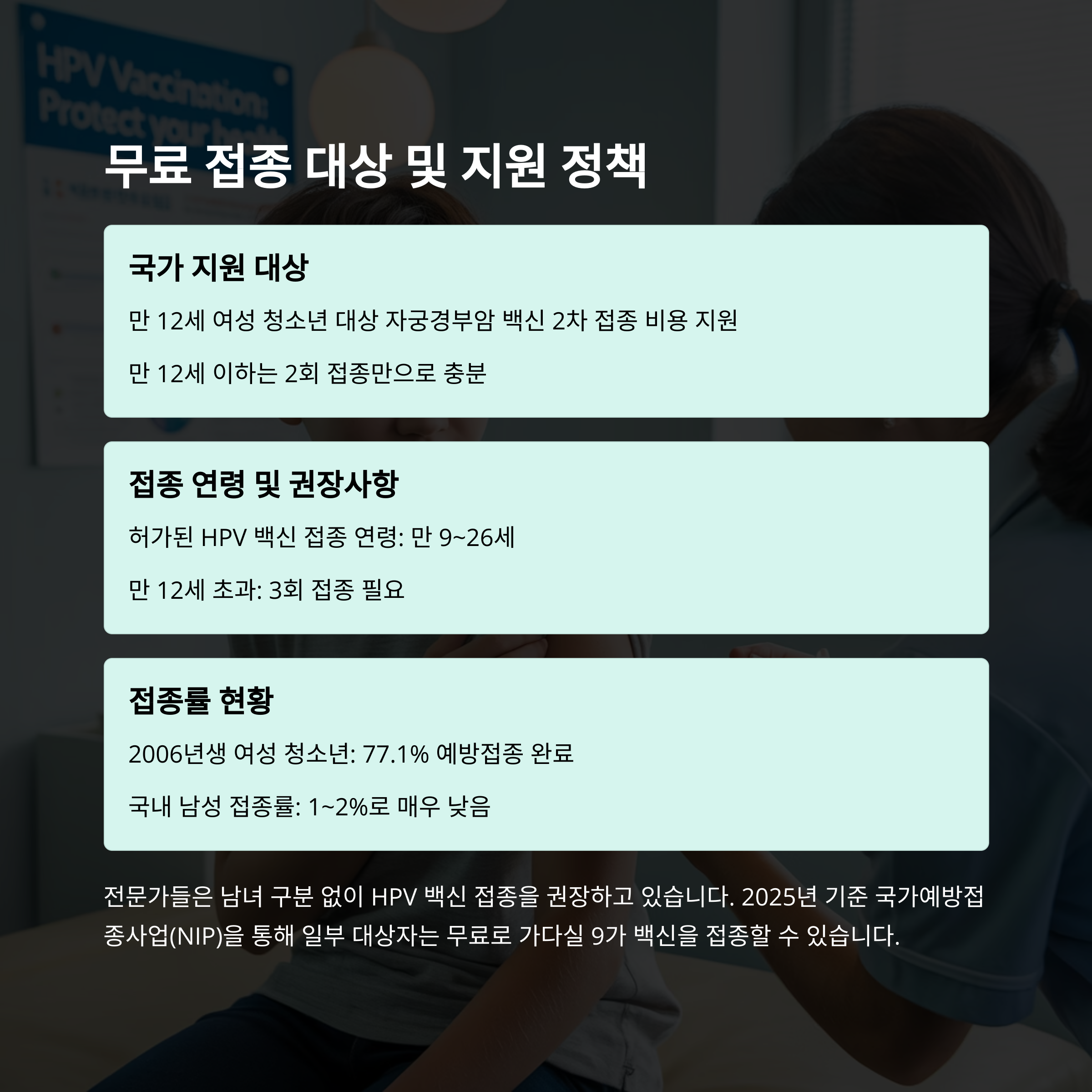 국가에서는 2025년 현재 만 12세 여성 청소년을 대상으로 무료 접종을 지원하고 있어요. 만 12세 이하는 2회 접종만으로 충분하며, 국가예방접종(NIP) 사업을 통해 비용 부담 없이 접종 가능합니다.