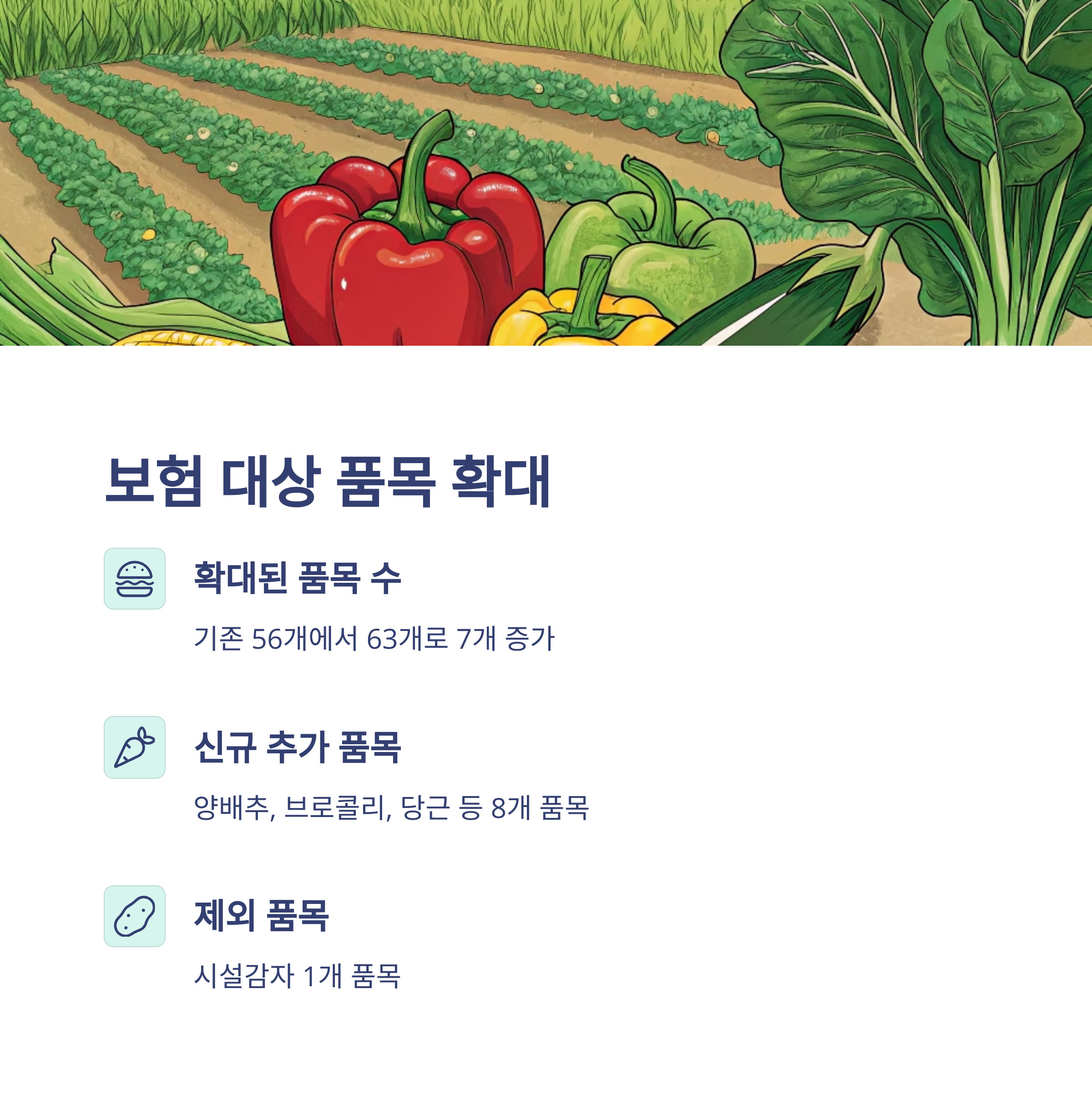 | 확대된 보험 품목 | 63개 (양배추, 브로콜리, 당근 등 8개 품목 추가, 시설감자 제외) |