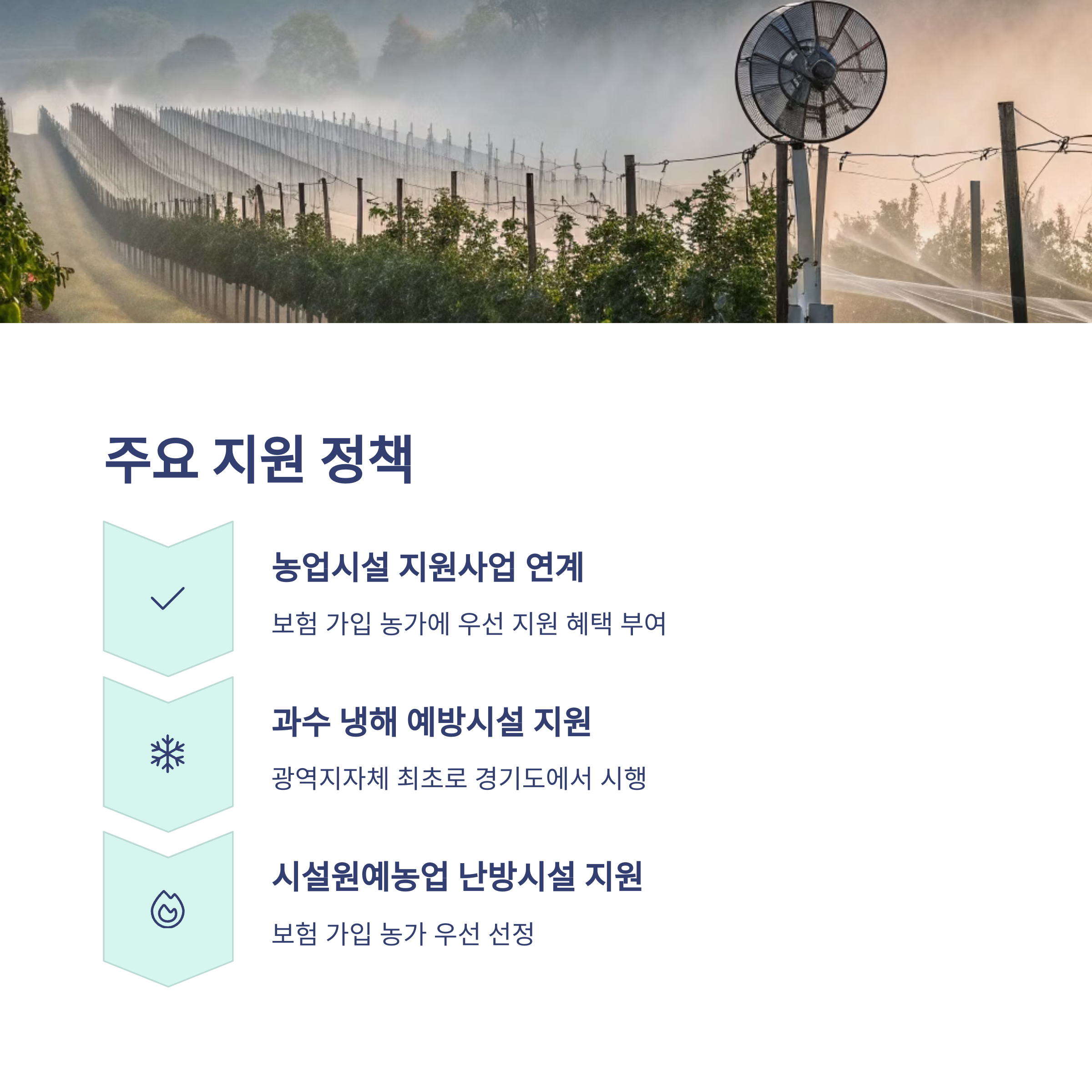 | 과수 냉해 예방시설 | 방상팬/미세살수장치 설치 농가 대상, 보험료 할인율 25%로 상향 |
