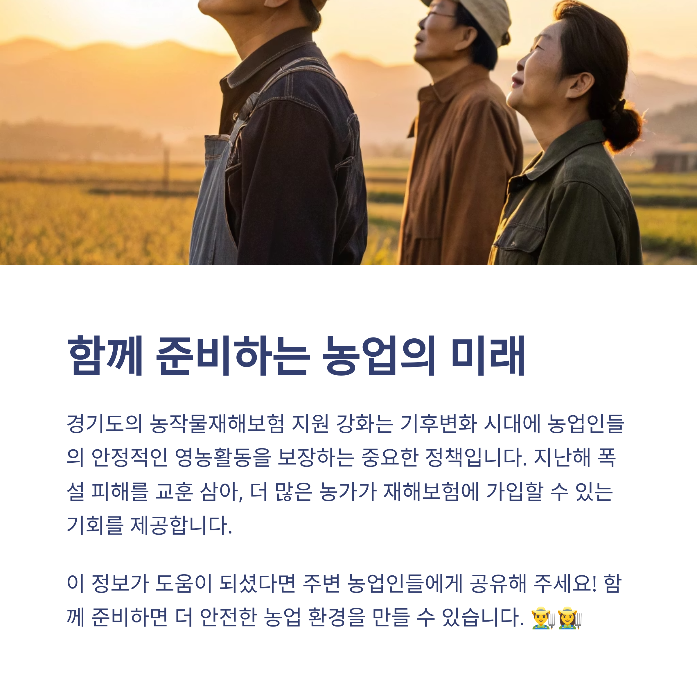 오늘 소개해드린 경기도의 농작물재해보험 지원 강화 정책, 어떠셨나요? 기후위기의 시대, 농업인 여러분께 꼭 필요한 정보였기를 바라며, 앞으로도 여러분이 안정적인 영농활동을 이어갈 수 있도록 도움이 되는 소식들 많이 전해드릴게요. 궁금하신 점이 있다면 댓글로 편하게 남겨주세요. 여러분의 소중한 의견은 항상 큰 힘이 됩니다!