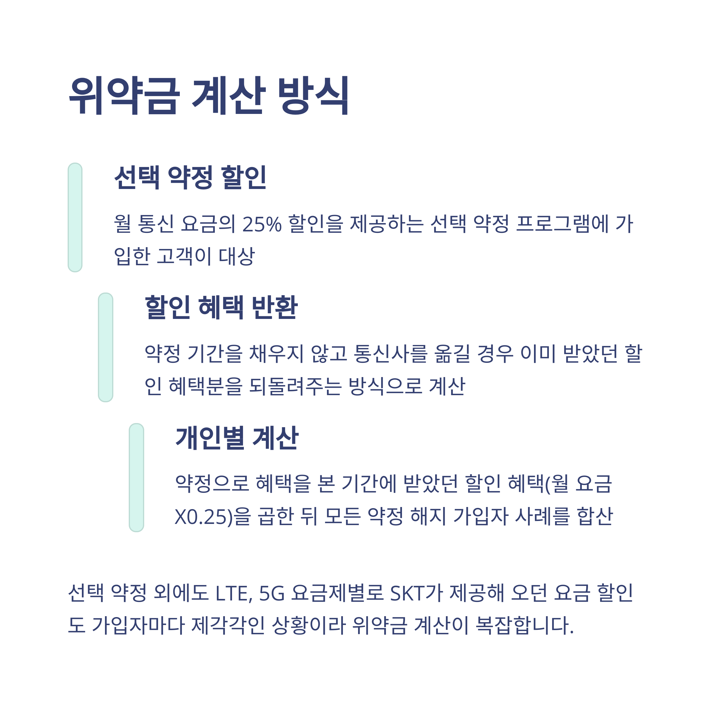 | 선택 약정 할인 | 월 통신 요금의 25%를 할인받은 금액을 기준으로 미이행 기간을 곱해 산정 |