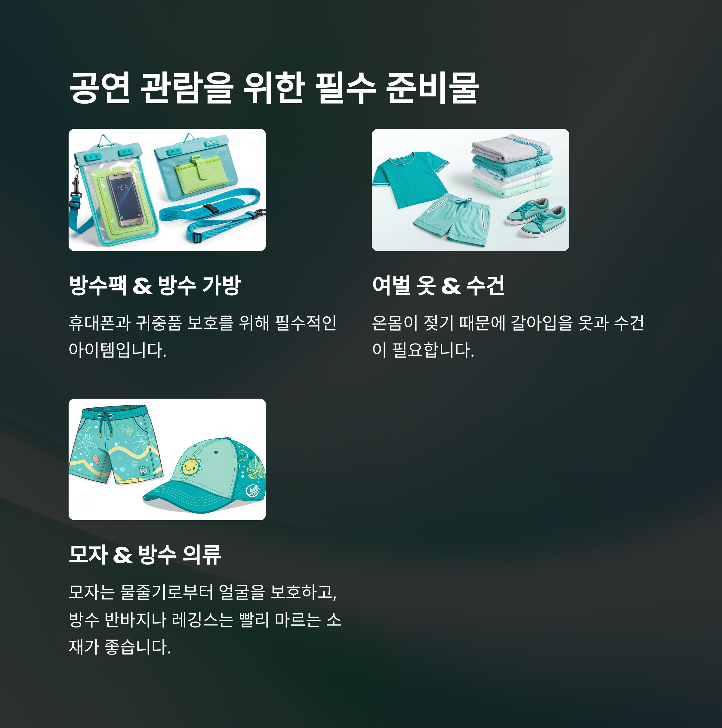 • 방수팩 & 방수 가방: 휴대폰, 지갑 필수 보호