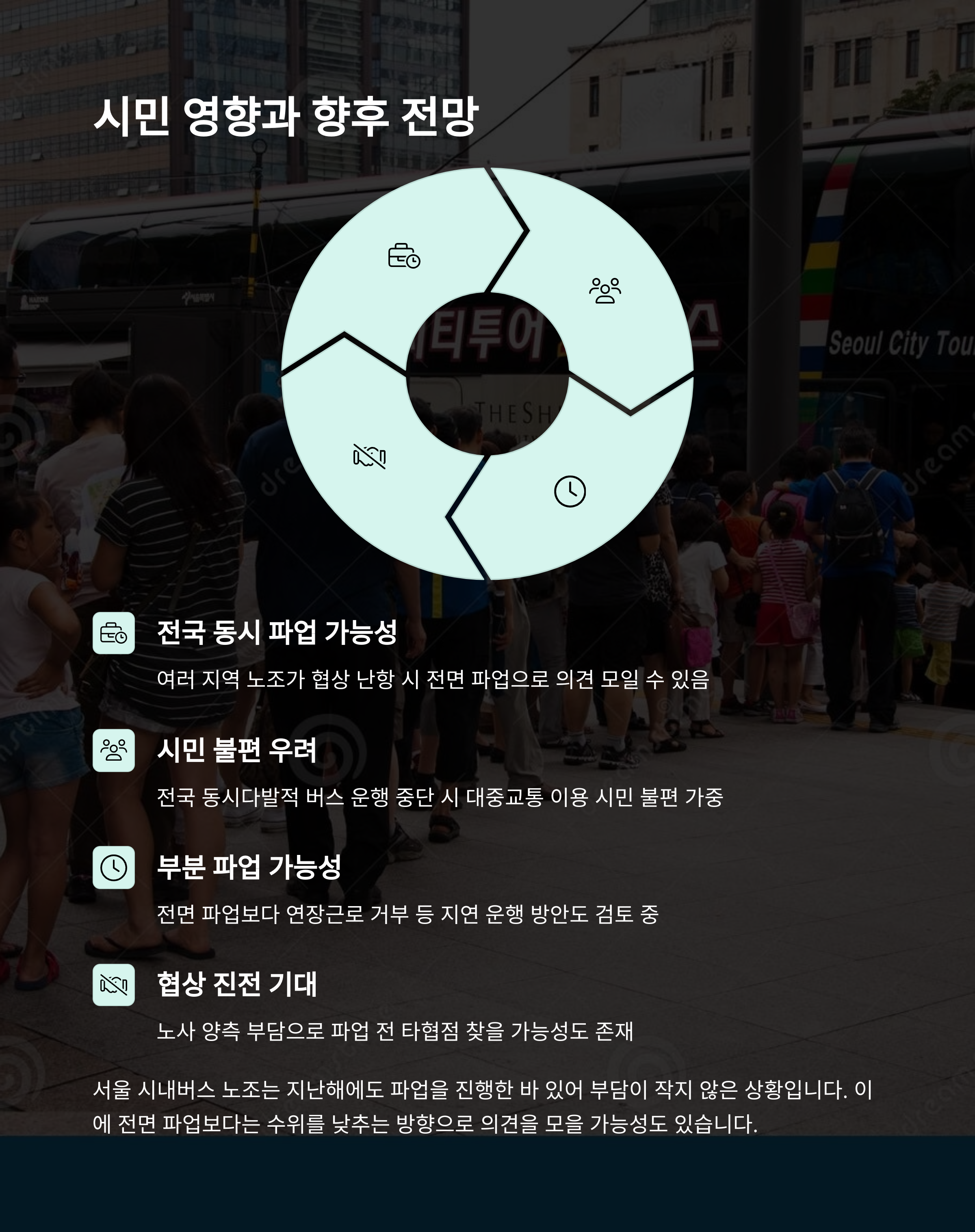 전면 파업이 현실화되면 이 불편은 단지 몇 분의 대기가 아니라, 도시 전체의 교통 시스템이 마비되는 사태로 이어질 수 있어요. 다만 서울 버스노조는 시민 불편을 고려해 연장근로 거부 같은 수위 조절 방안을 병행하며, 마지막까지 협상 여지를 남겨두고 있는 상황입니다.