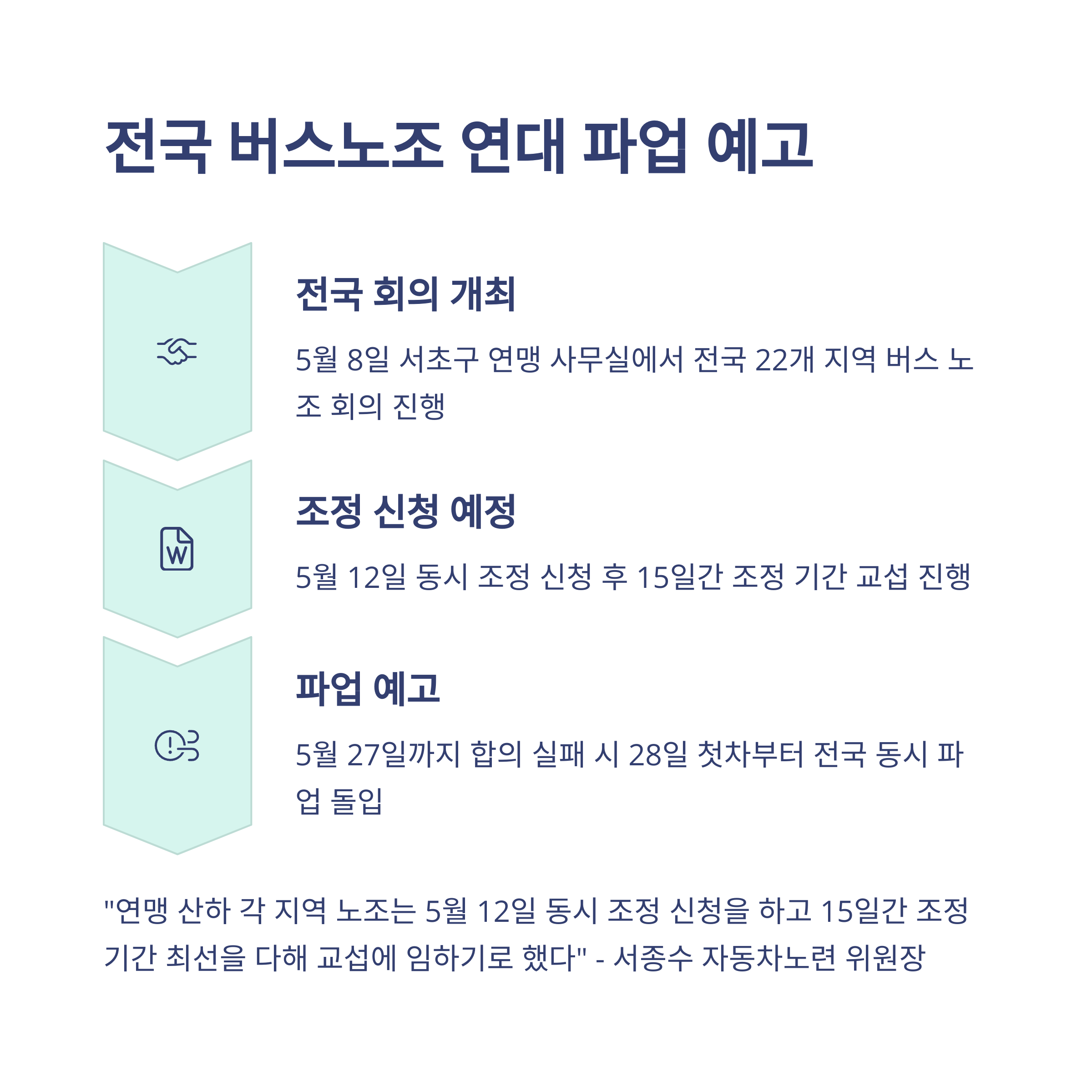 서울만의 문제가 아닙니다. 전국 22개 지역의 버스노조가 5월 28일 동시 파업을 예고하고 있어요. 특히 한국노총 전국자동차노동조합연맹은 서울·부산 등 주요 대도시 노조들과 함께 5월 12일 조정 신청을 하고, 조정 기간인 15일이 끝난 뒤에도 합의가 없을 경우 28일부터 첫차부터 파업에 돌입한다고 밝혔습니다.
