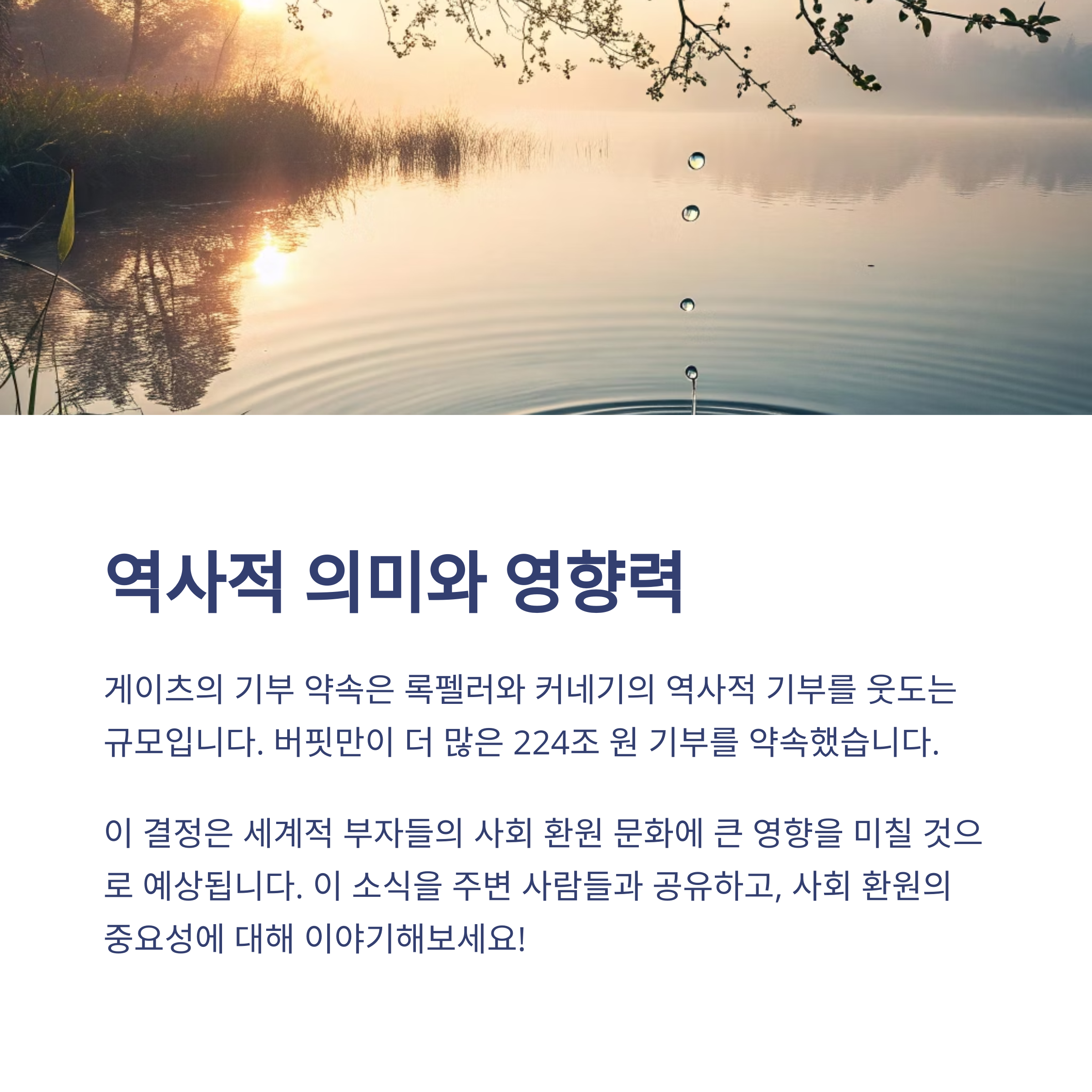 이번 빌 게이츠의 발표는 역사적으로도 매우 큰 의미를 갖습니다. 인류 역사상 가장 거대한 자선 기부로 알려진 존 록펠러와 앤드류 커네기의 행보를 뛰어넘는 규모이며, 기부 방식 또한 현대에 맞게 설계되어 있습니다. 무엇보다 생전에 대부분의 자산을 사회에 환원하겠다는 의지는 많은 부자들에게 영감을 주고 있으며, 단순히 돈을 나누는 것을 넘어, 세상을 함께 바꾸어가는 철학적 메시지를 던지고 있습니다. 이는 앞으로 글로벌 자산가들의 사회적 책임 수행 방식에 큰 변화를 불러올 수 있습니다.