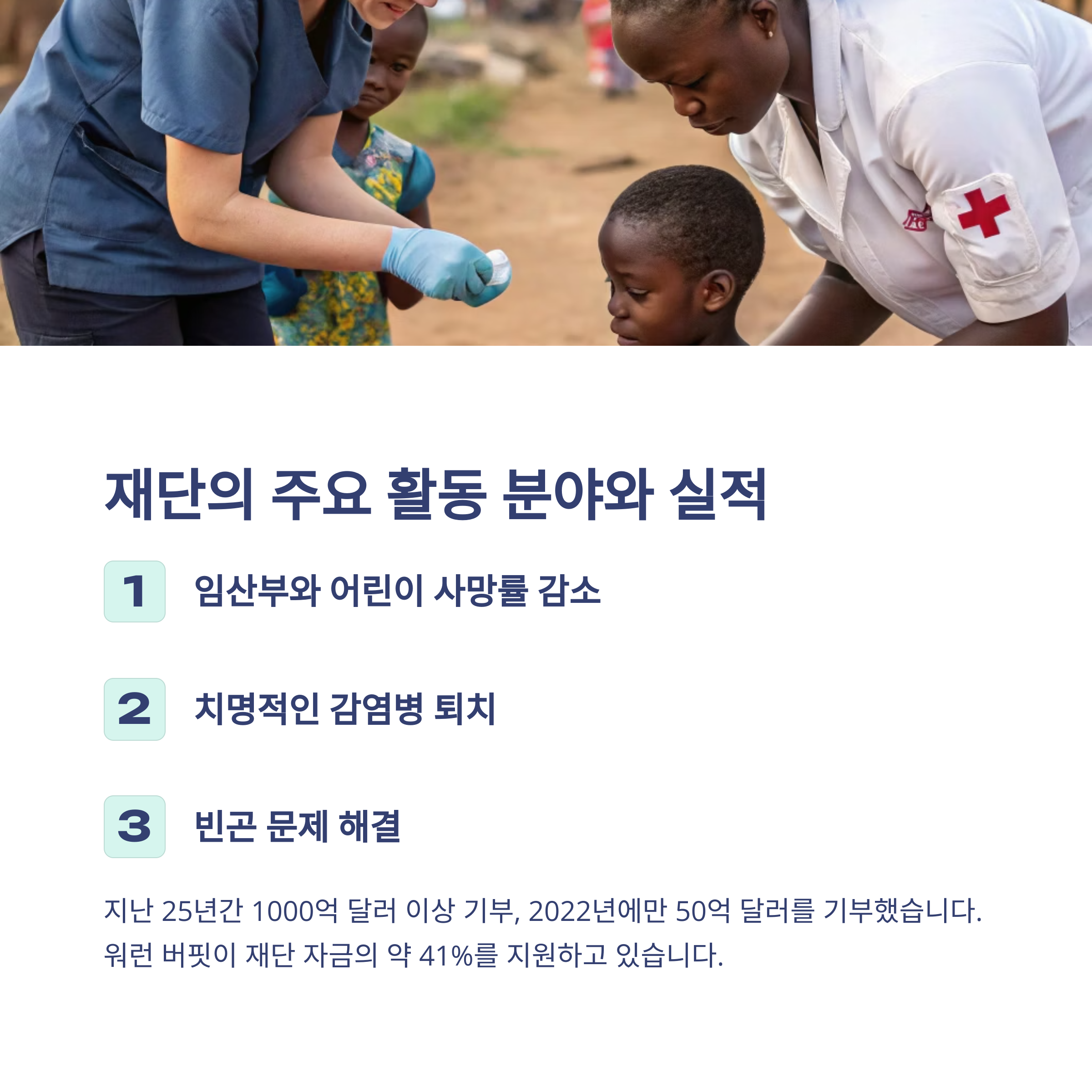 주로 건강, 교육, 빈곤 해결 등에 초점을 맞추며, 백신 개발, 보건 인프라 구축, 기후 변화 대응까지 폭넓은 활동을 진행하고 있어요.
