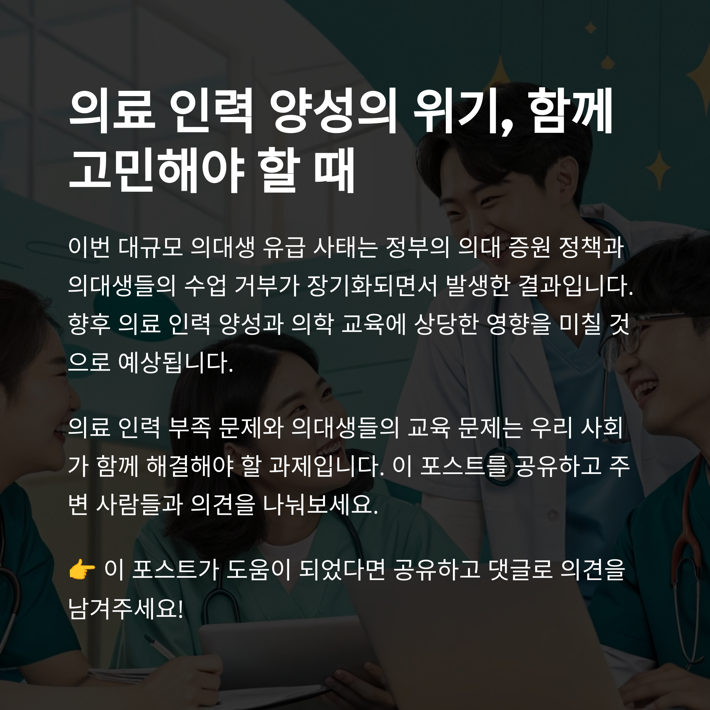 오늘 함께 살펴본 의대생 유급 사태는 단지 학교에서의 징계나 행정 조치로 끝날 수 있는 사안이 아닙니다. 현재의 결정이 향후 의료 인력 공급, 의학 교육 체계, 더 나아가 국민의 건강권에까지 어떤 영향을 미칠지 우리는 주의 깊게 지켜봐야 합니다.