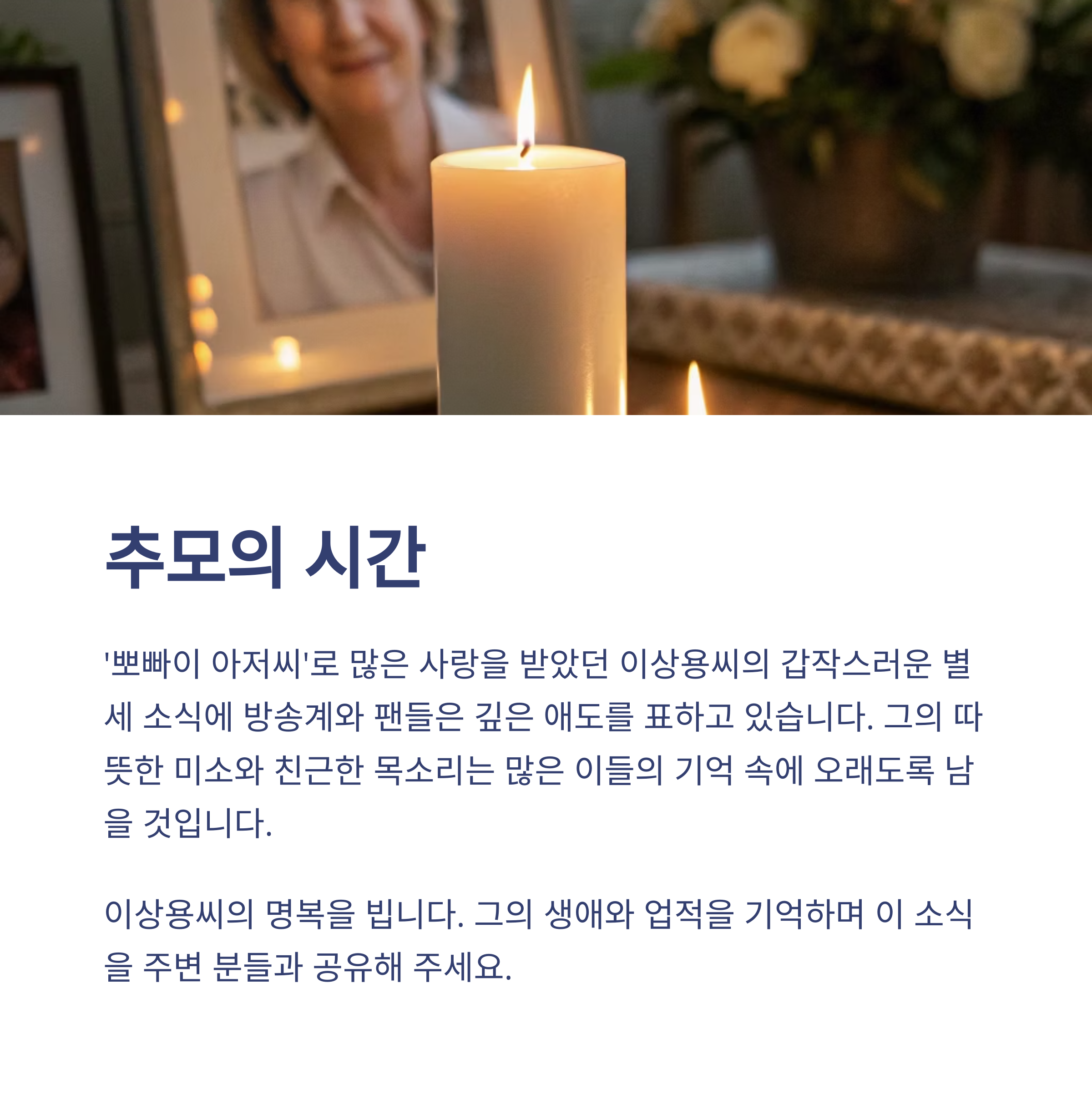 여러분도 혹시 ‘우정의 무대’를 보며 울고 웃던 기억 있으신가요? 댓글로 여러분의 추억을 함께 나눠주시면 감사하겠습니다. 따뜻한 기억과 공감이 필요한 오늘, 우리 함께 그를 추모하며 조용히 마음을 모아봅니다.