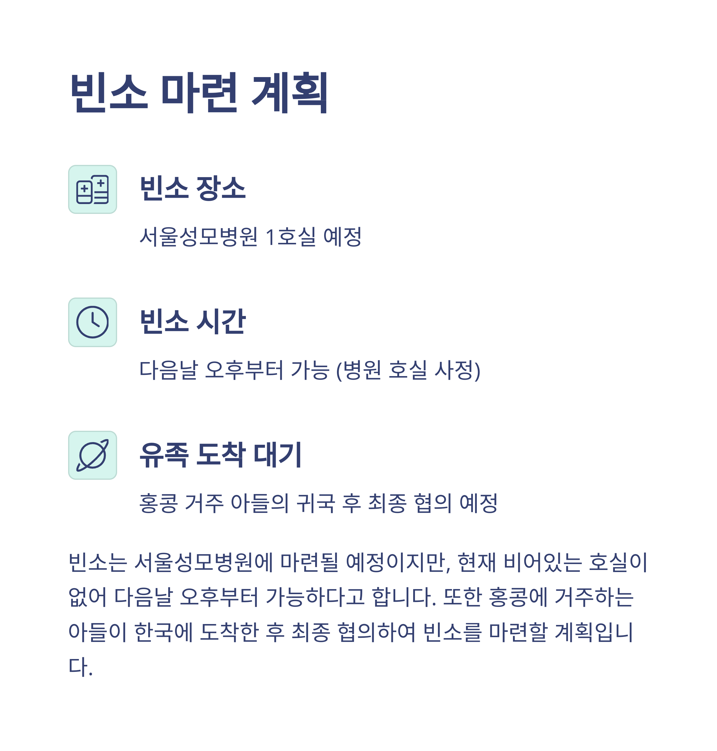 서울성모병원 장례식장 1호실에 마련될 예정입니다. 다만, 사용 가능 시점은 아들의 귀국 이후로 조정될 수 있습니다.
