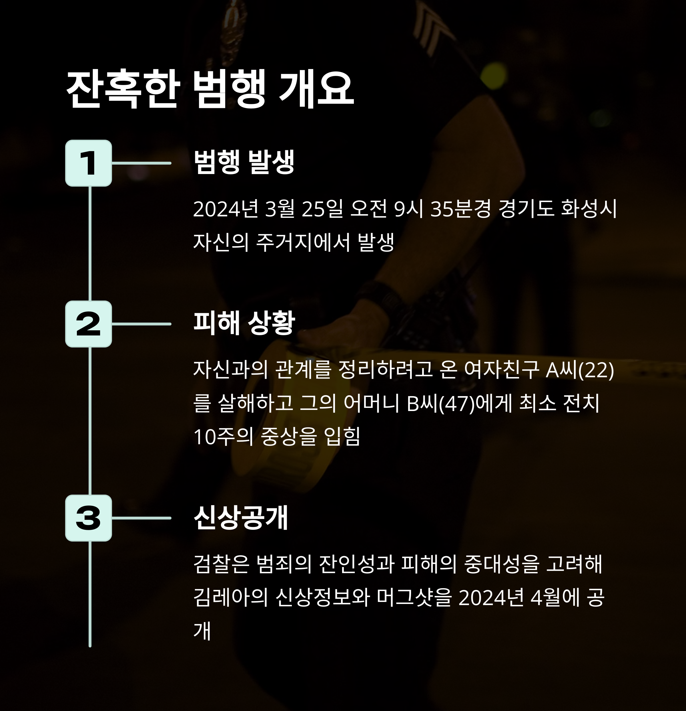 2024년 3월 25일 아침, 경기도 화성의 한 아파트에서 22세 A씨와 그녀의 어머니는 평범하지 않은 작별을 맞이했습니다. 그 자리에서 기다리고 있던 건 전 연인 김레아였죠. 이별 통보를 받자마자 찾아온 감정의 격류는 끔찍한 살인으로 이어졌습니다. 평소 폭력 전과도 없고 조용했다는 주변인의 증언은 오히려 충격을 배가시켰습니다. 이 사건은 데이트폭력의 본질이 얼마나 예측 불가능하고, 언제든지 현실이 될 수 있는지 경고하는 하나의 사례가 되었습니다.