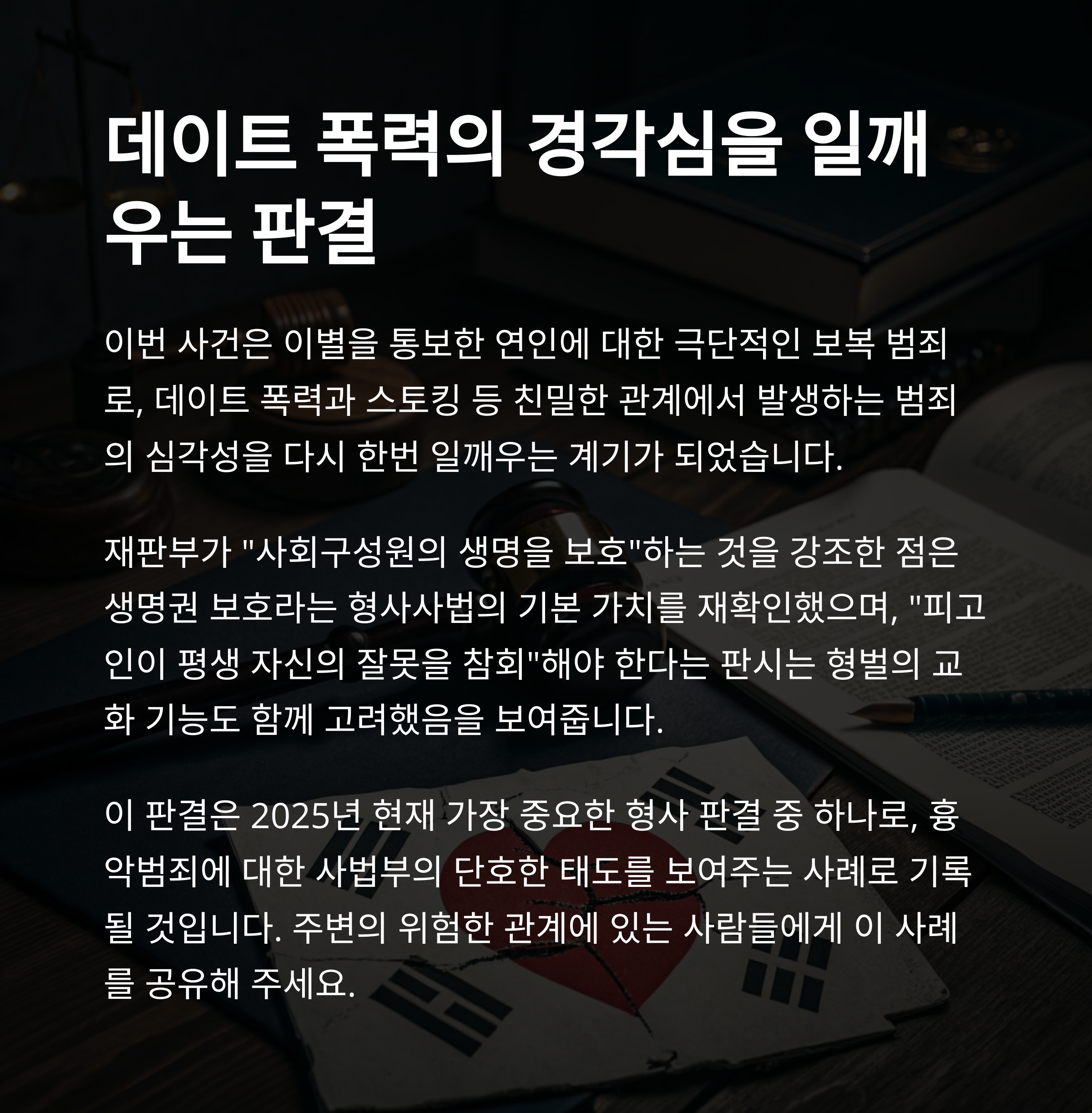 이번 사건은 단순히 한 개인의 충동적 범죄로 치부하기엔 그 무게가 너무 큽니다. 교제 중이거나 헤어짐을 겪는 수많은 커플에게 '사랑'이라는 이름으로 위장된 폭력이 얼마나 위험할 수 있는지를 적나라하게 보여준 사례였죠. 재판부는 이 사건을 통해 명확히 말했습니다. “정서적 집착이 범죄로 이어졌을 때, 법은 더 이상 관용을 베풀지 않는다.”