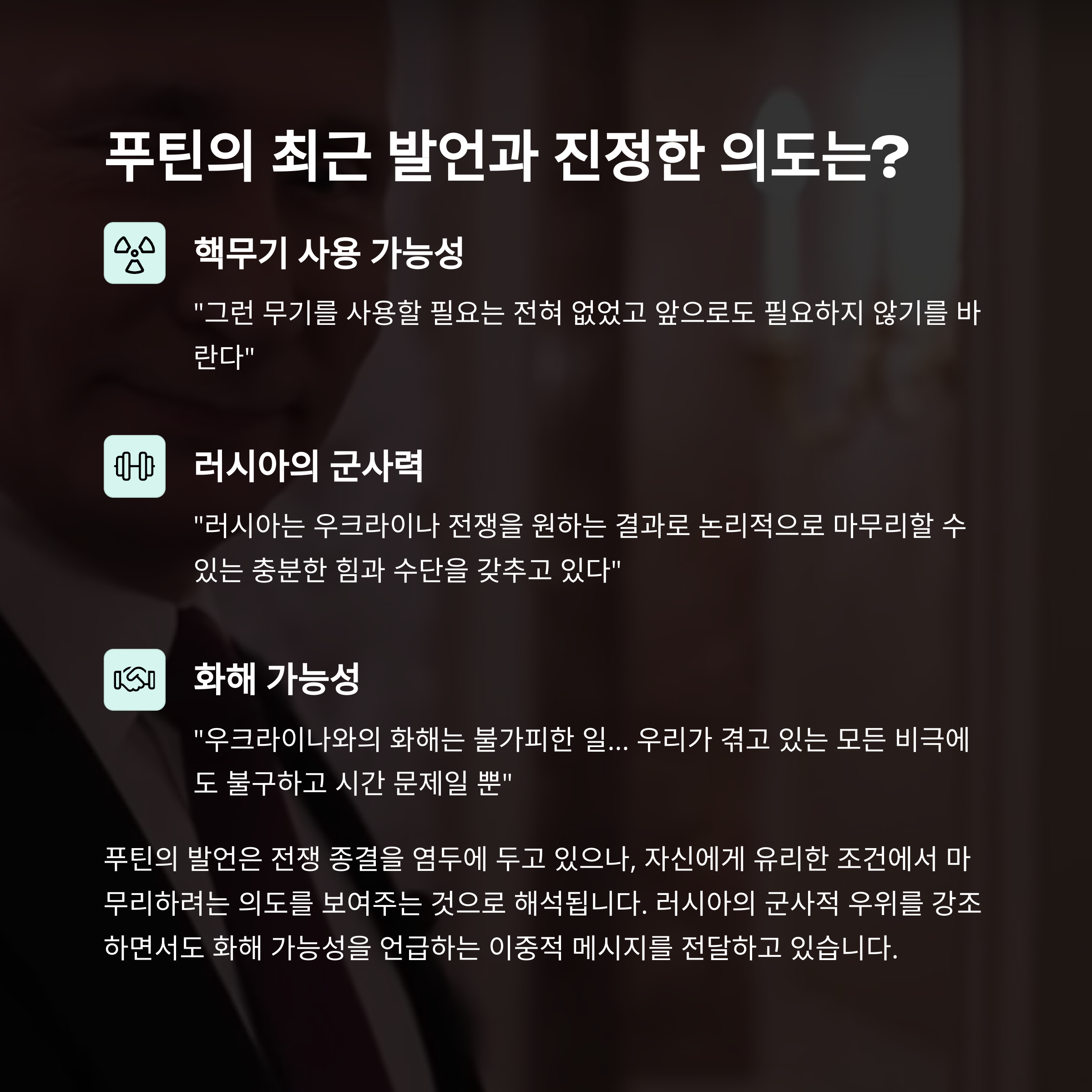푸틴은 협상 가능성을 열어놓았지만, 전제 조건 없는 진짜 휴전을 원한다기보다 정치적 계산이 깔린 제안일 수 있습니다.