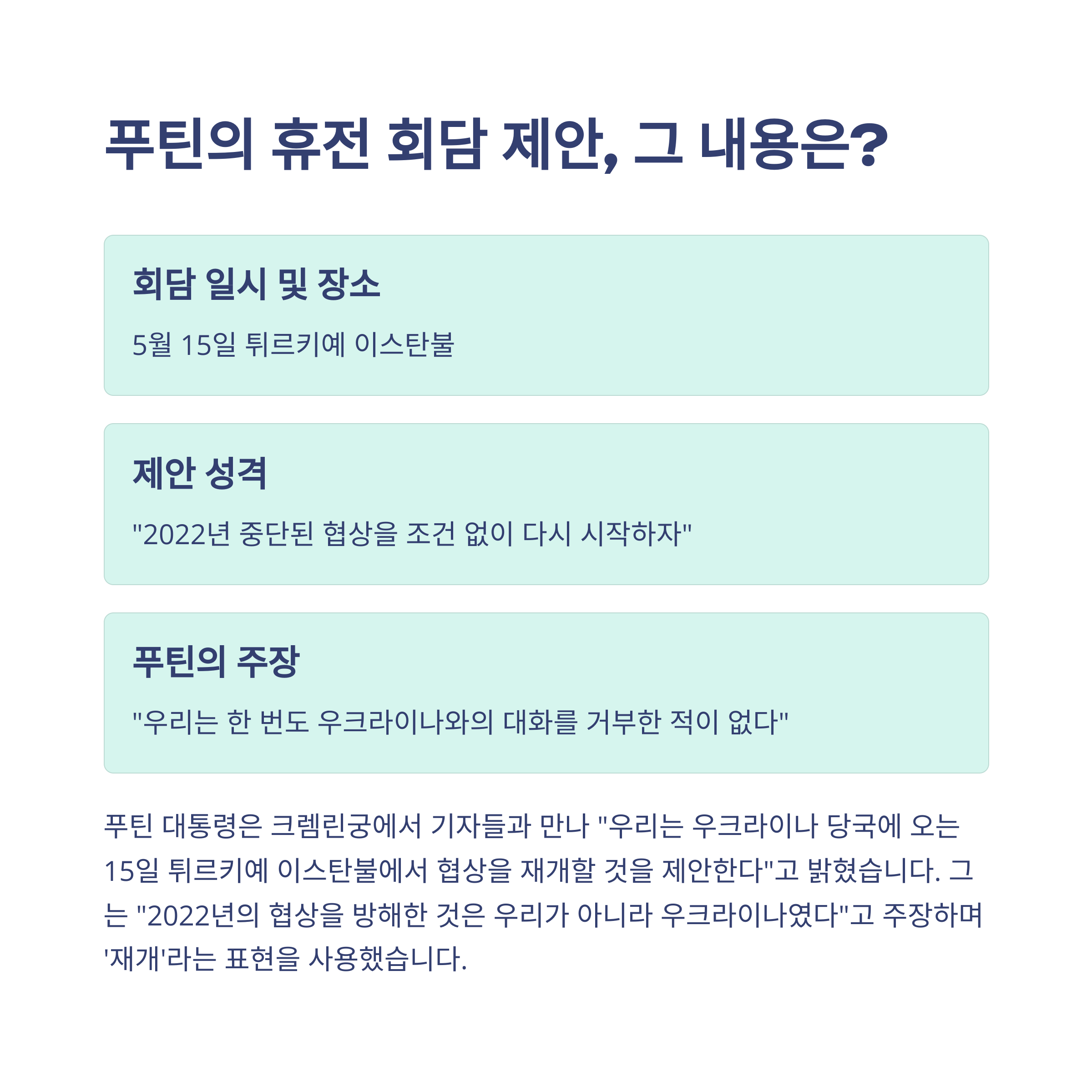 푸틴은 협상 가능성을 열어놓았지만, 전제 조건 없는 진짜 휴전을 원한다기보다 정치적 계산이 깔린 제안일 수 있습니다.