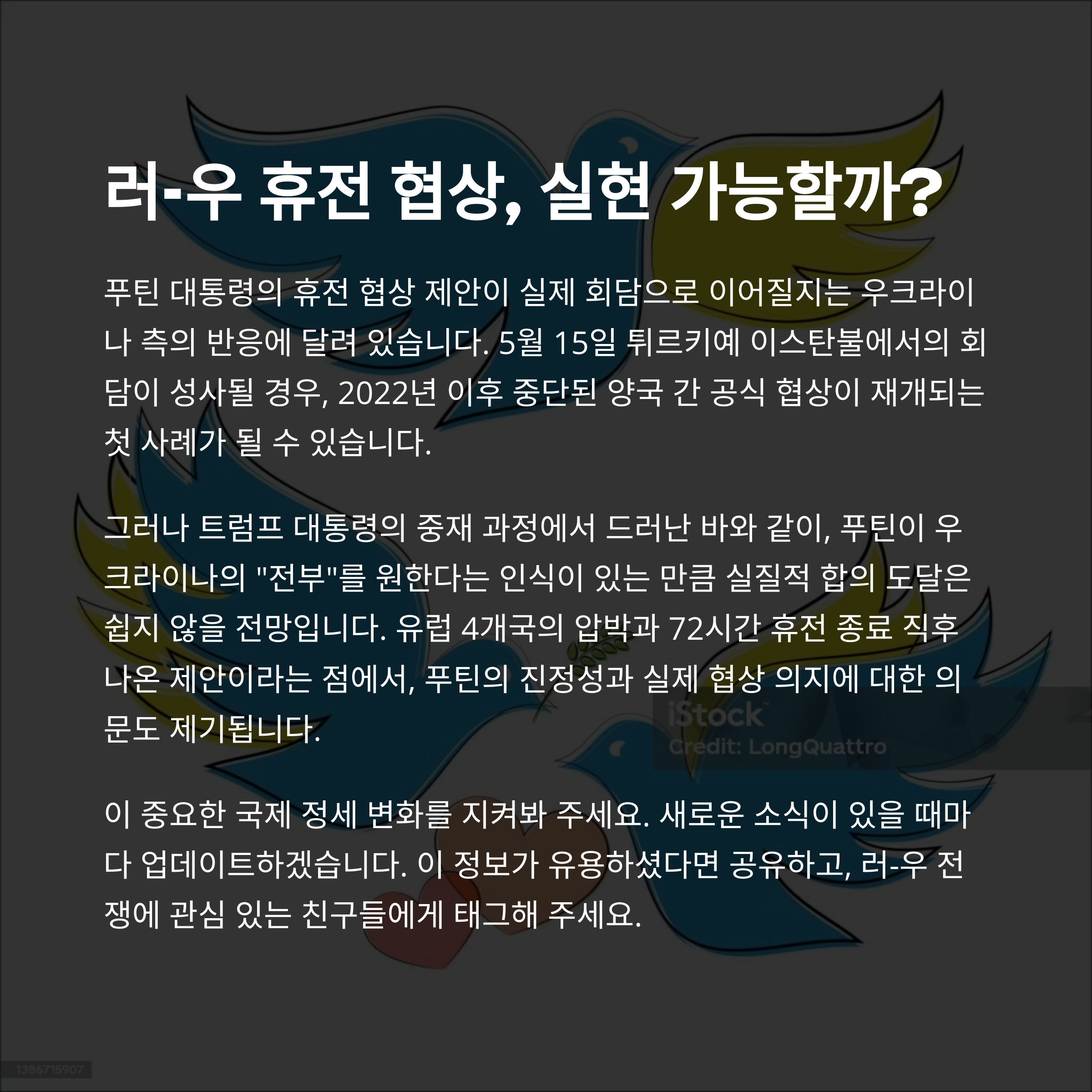 우리는 뉴스 속 전쟁 이야기들을 너무 자주 듣고 살고 있습니다. 그래서일까요, 평화라는 단어가 점점 더 멀게만 느껴지는 요즘이에요. 하지만 푸틴의 이번 회담 제안이 단지 외교적 수사로 끝나지 않고, 정말 대화의 장으로 이어졌으면 좋겠습니다. 이스탄불에서 마주 앉게 될 두 나라의 대표들이 서로의 입장을 솔직하게 주고받고, 최소한의 신뢰라도 쌓을 수 있는 계기가 되었으면 해요. 전쟁은 어떤 명분으로도 정당화될 수 없다는 사실, 우리 모두 다시 되새겨봐야 할 때입니다. 여러분의 생각은 어떠신가요? 댓글로 함께 나눠주세요.