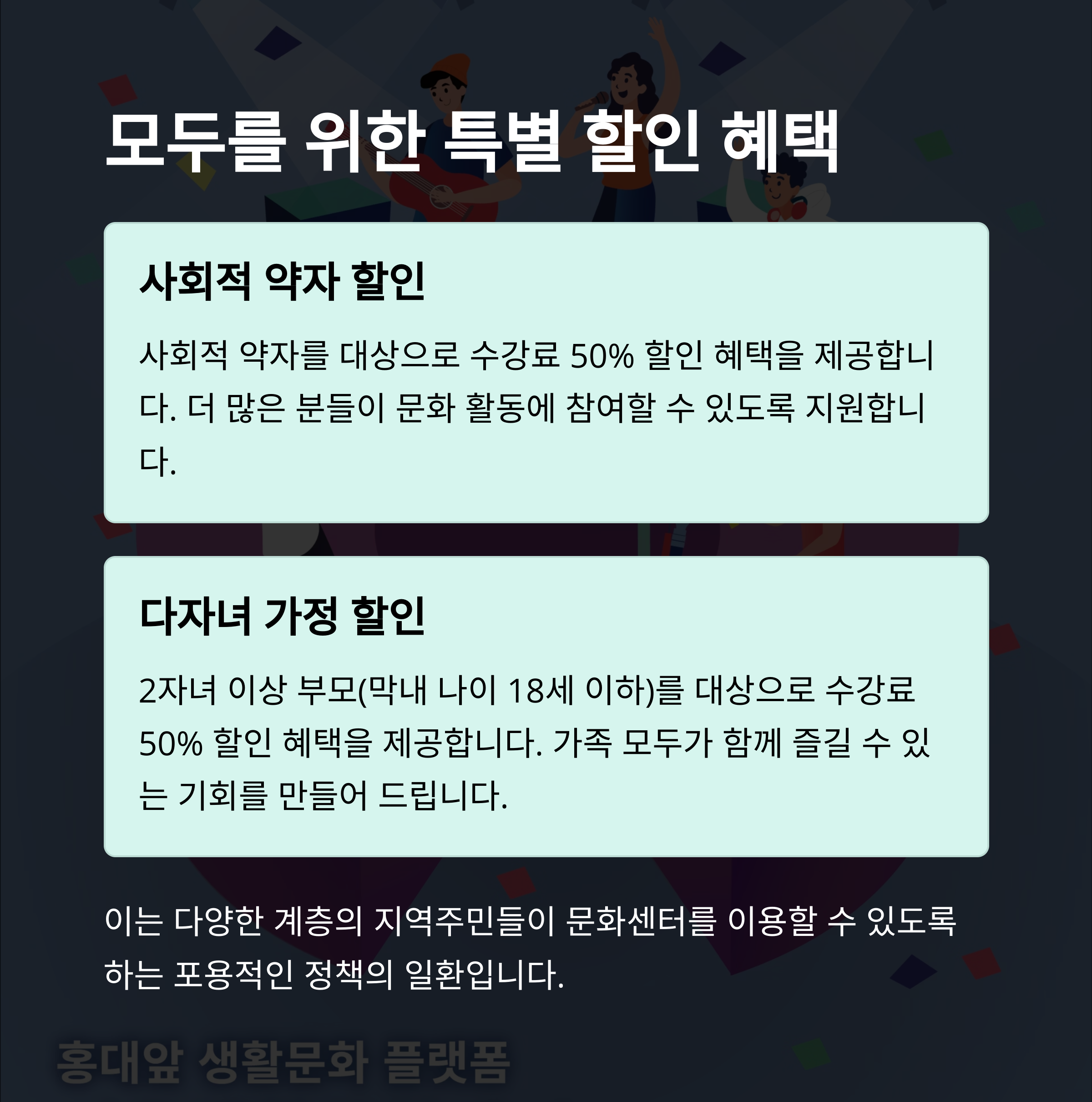 사회적 약자와 2자녀 이상 가정(막내 만 18세 이하)에게 수강료의 50% 할인 혜택이 제공됩니다.