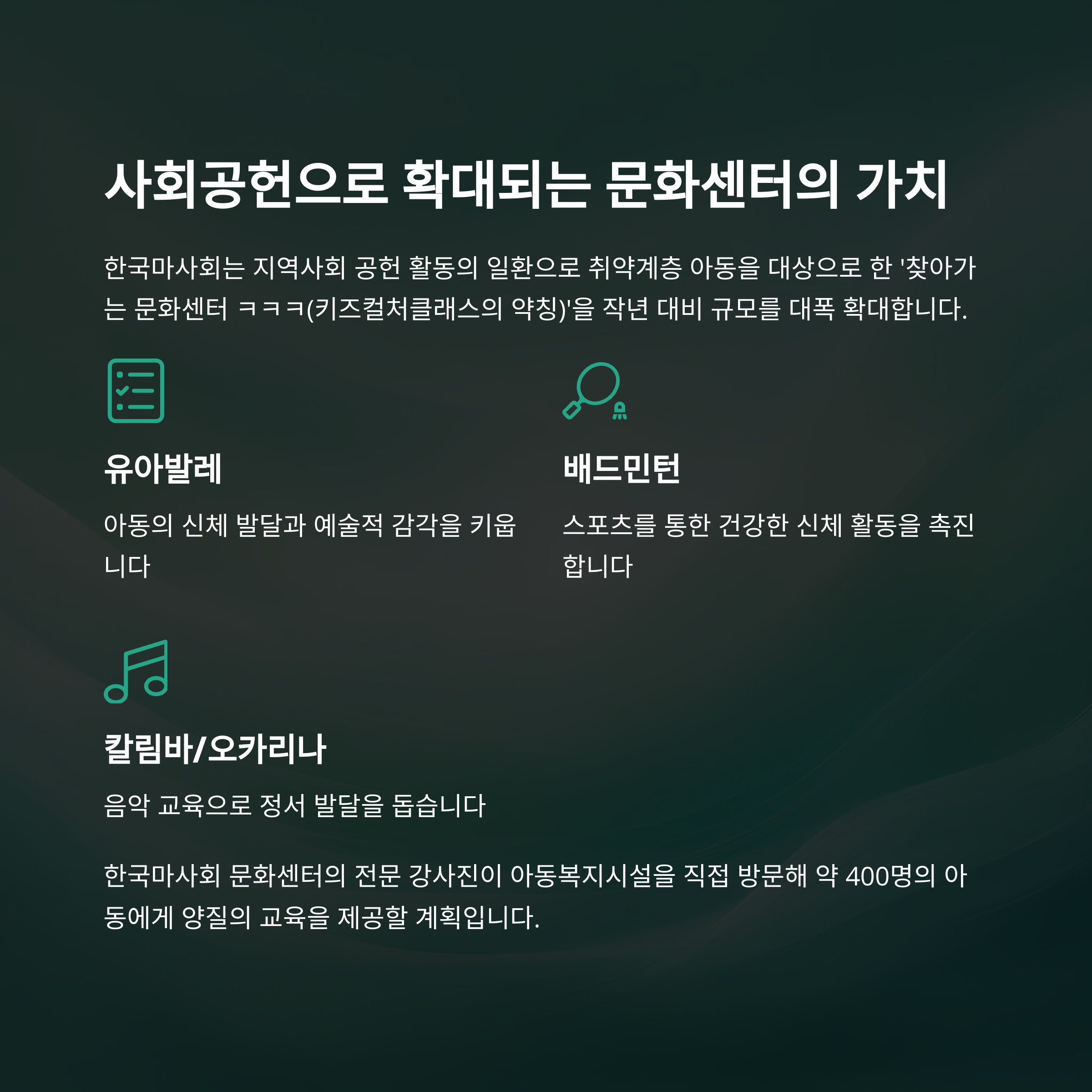 | 주요 강좌 | 유아발레, 배드민턴, 칼림바, 오카리나 등 |