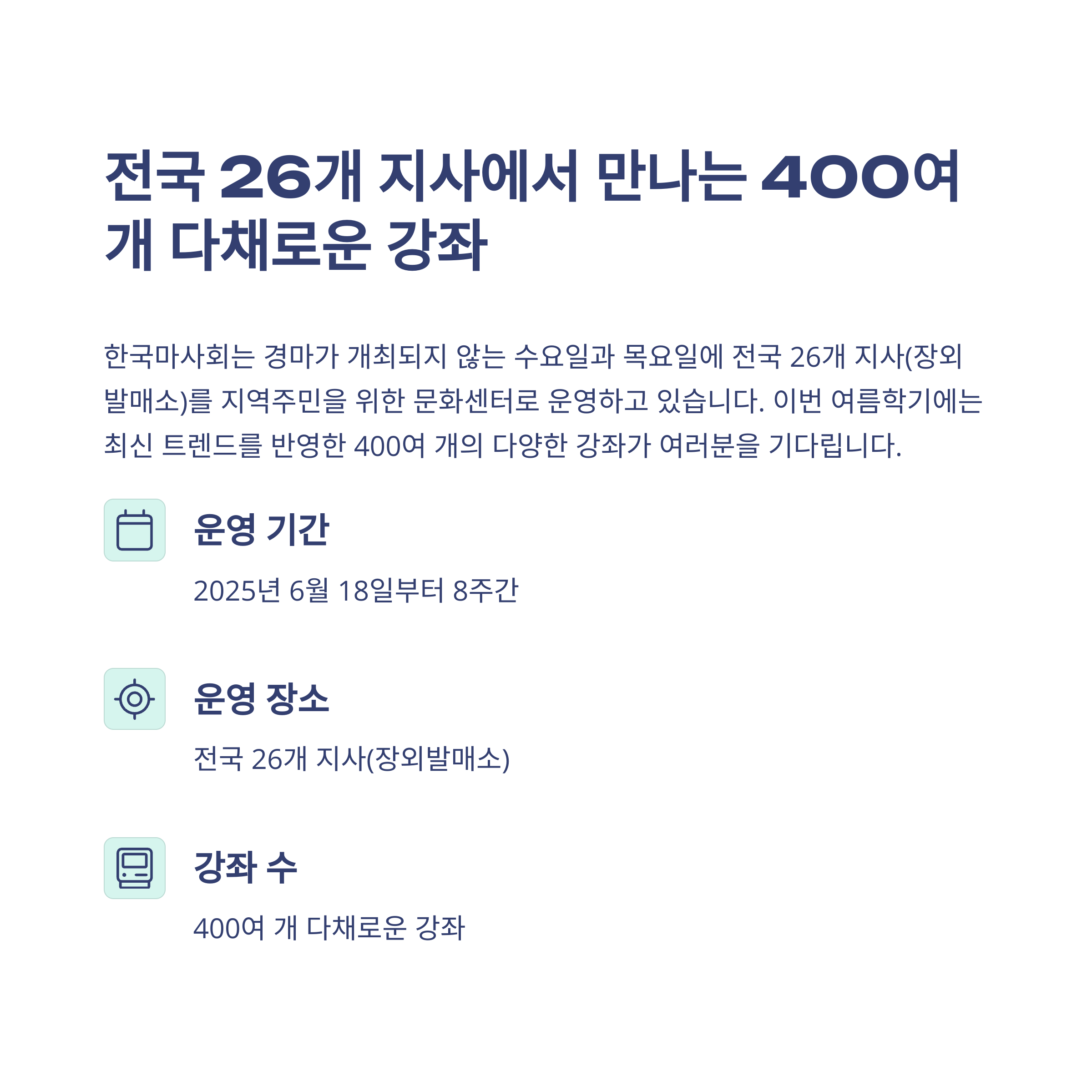 한국마사회 문화센터는 경마가 열리지 않는 수요일과 목요일, 전국 26개 지사를 지역 주민에게 개방해 다양한 문화 강좌를 운영하는 특별한 공간이에요. 백화점 문화센터처럼 비싼 수강료에 부담을 느낀 적 있다면, 여기가 진짜 찐입니다. 저렴한 수강료로 트렌디한 강좌부터 아이들 프로그램까지, 그야말로 ‘가성비 최고’의 문화생활이 가능한 곳이죠.