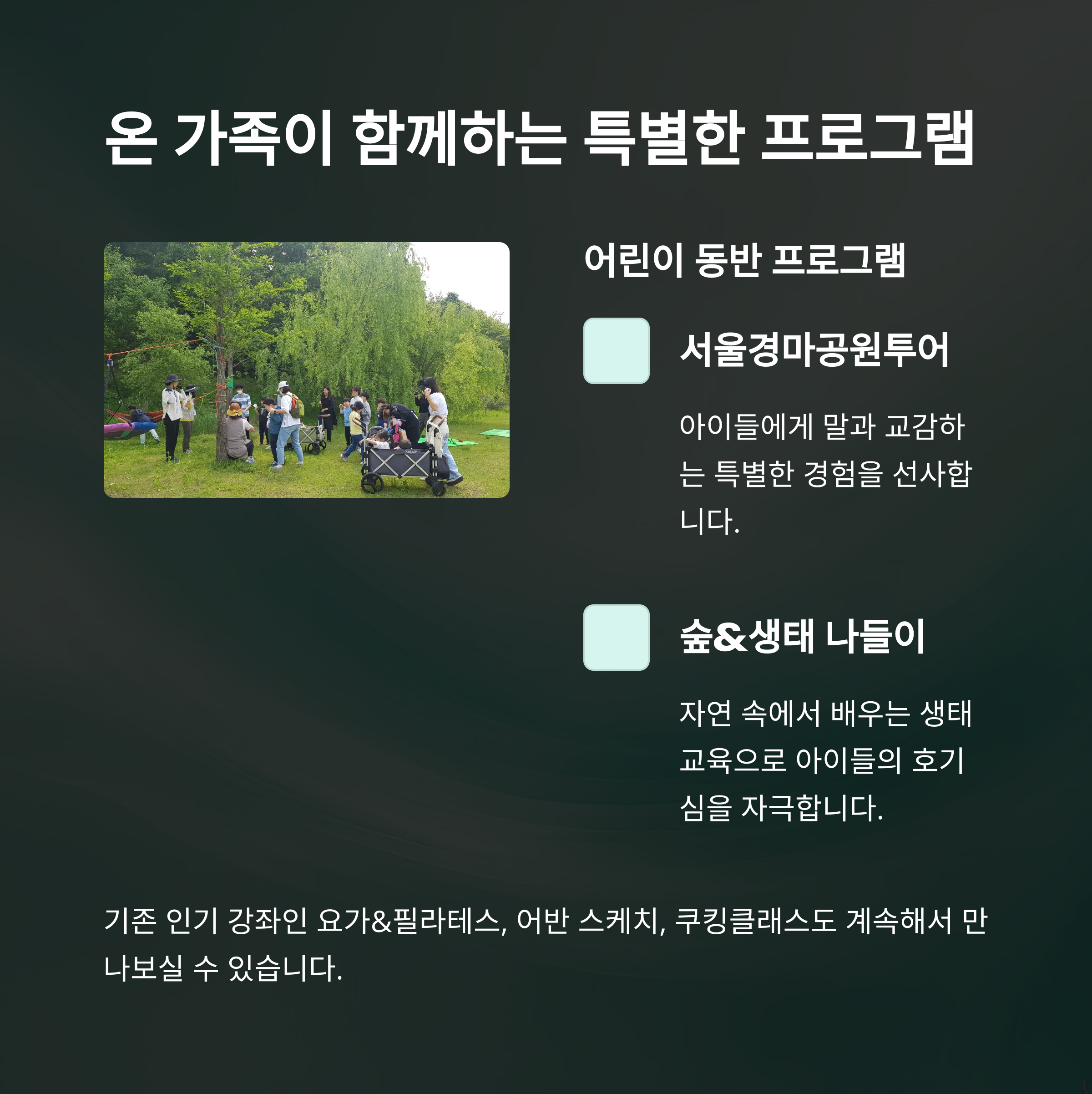 요가, 필라테스, 메이크업, 쿠킹클래스, 아이들과 함께하는 체험 프로그램까지 다양하게 구성되어 있어요.