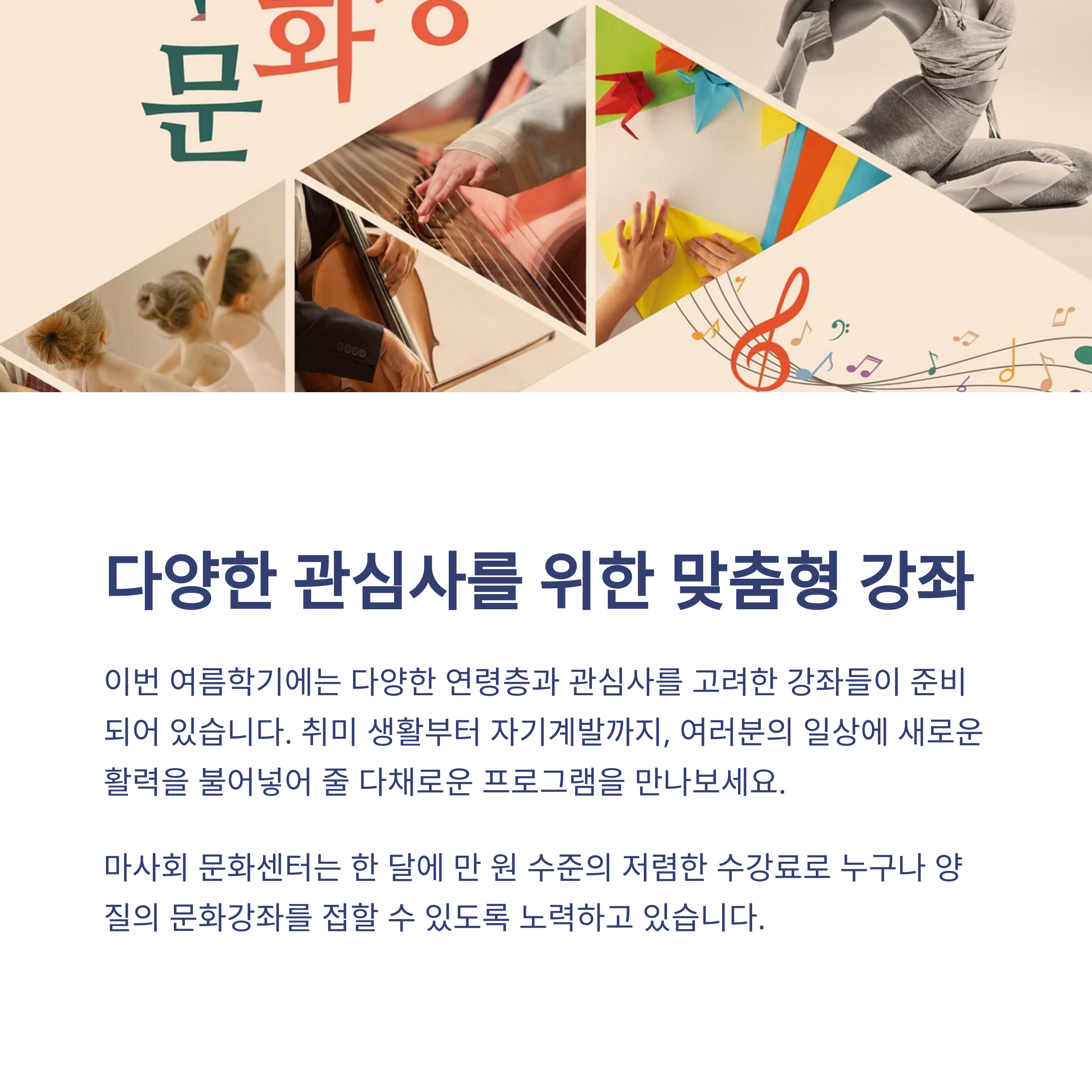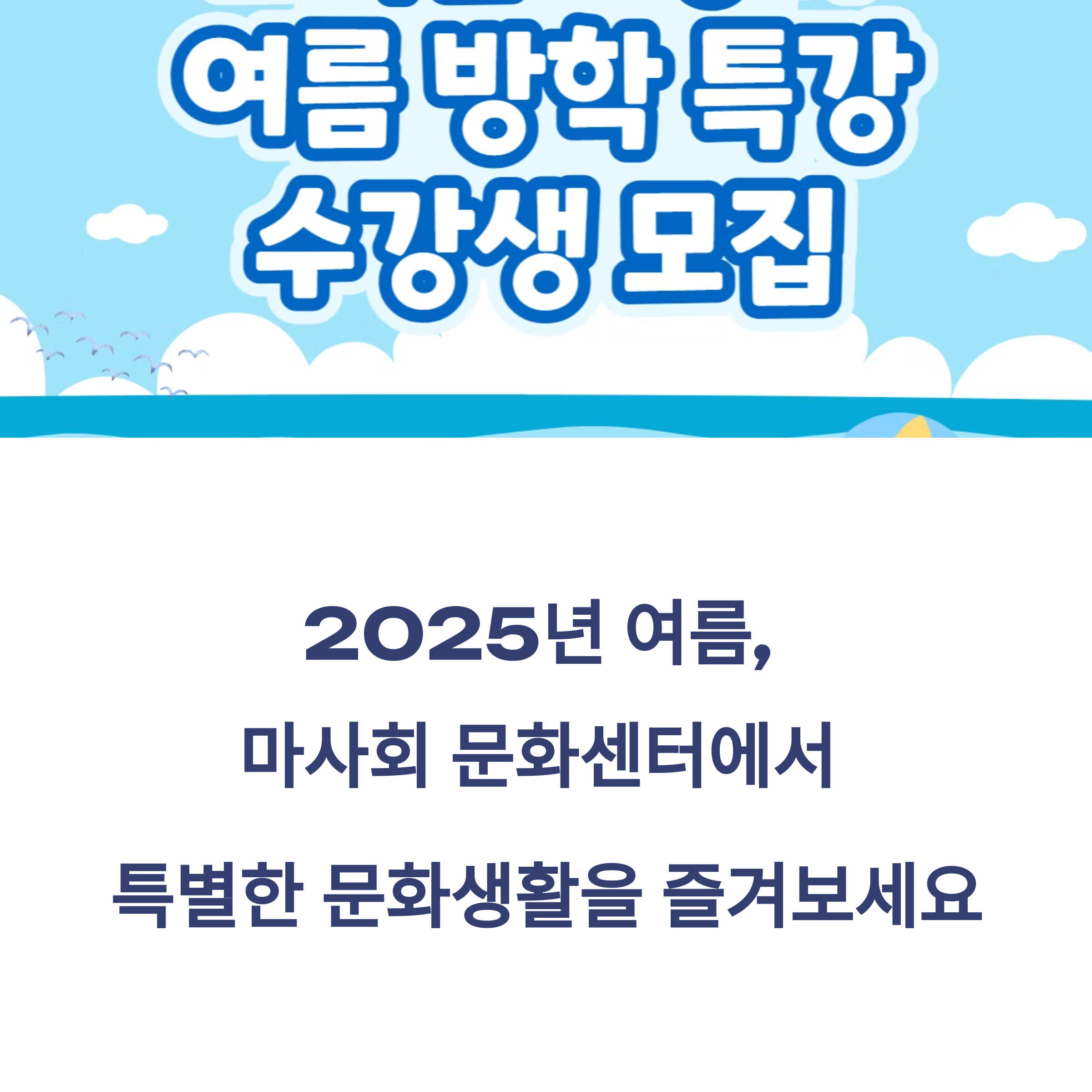 올여름, 여러분의 일상에 조금 더 특별한 순간을 더해보는 건 어떨까요? 마사회 문화센터는 단순한 강좌 공간이 아니라, 지역사회와 함께 숨 쉬는 열린 문화 플랫폼입니다. 선풍기 바람 아래 책만 읽기엔 너무 아까운 계절이에요. 아이와 함께, 친구와 함께, 혹은 나 혼자라도 괜찮아요. 잠깐의 용기와 신청 하나면, 여러분의 여름이 훨씬 다채로워질 거예요. 문화생활의 문턱을 낮춘 마사회 문화센터에서, 의미 있는 여름을 보내보세요.