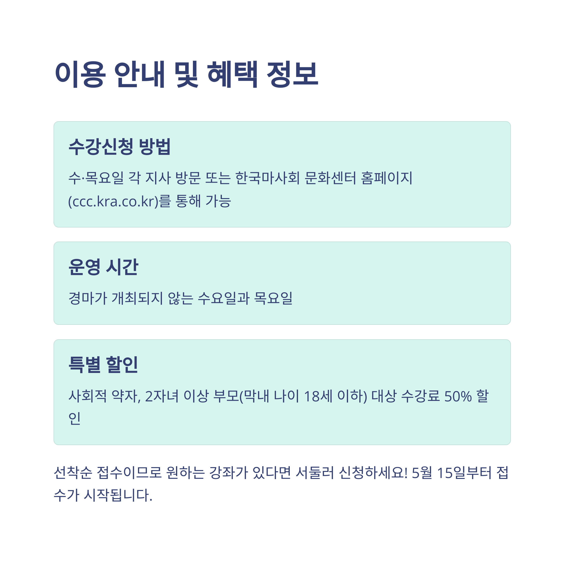 마사회 문화센터가 좋은 이유? 바로 '포용성'에 있어요. 수강료 자체도 저렴한데, 사회적 약자와 다자녀 가정에게는 추가 할인까지 제공한다는 사실! 해당되는 분들은 꼭 이 혜택 챙기세요.