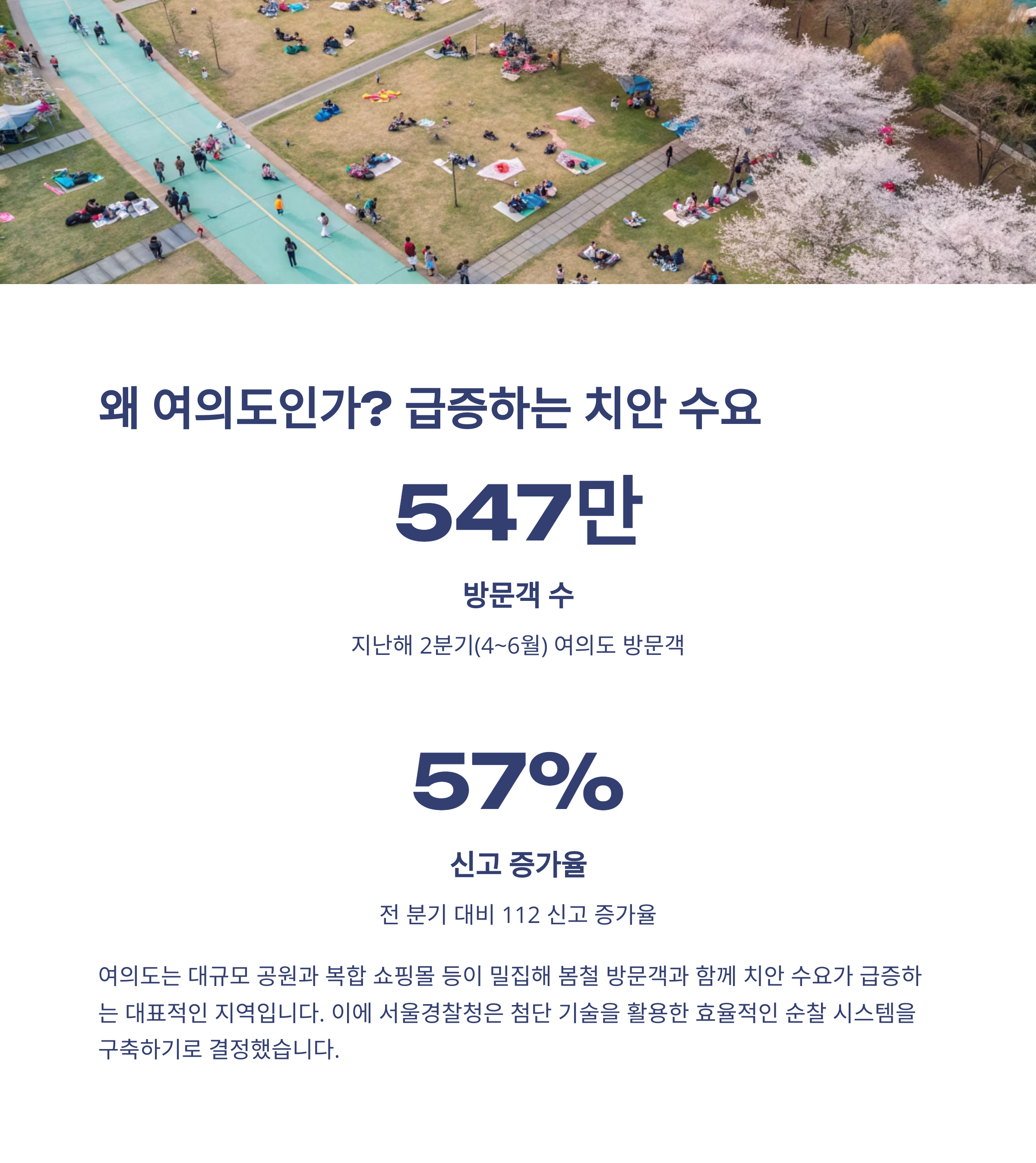 서울 한복판에 위치한 여의도는 평일엔 금융 중심지, 주말엔 관광과 휴식의 명소로 변신하는 특이한 지역이에요. 대형 공원, 복합 쇼핑몰, 한강공원까지... 봄만 되면 사람들이 어마어마하게 몰려드니까 자연스레 치안 수요도 폭증하죠. 작년 2분기에만 약 547만 명이 여의도를 다녀갔다고 하니, 상상되시나요? 그래서 이번 'K-스마트 순찰' 프로젝트는 이런 특수성을 지닌 여의도에서 먼저 시작하게 된 거예요. 실험적 기술이 도입되기엔 딱 좋은 조건이죠.