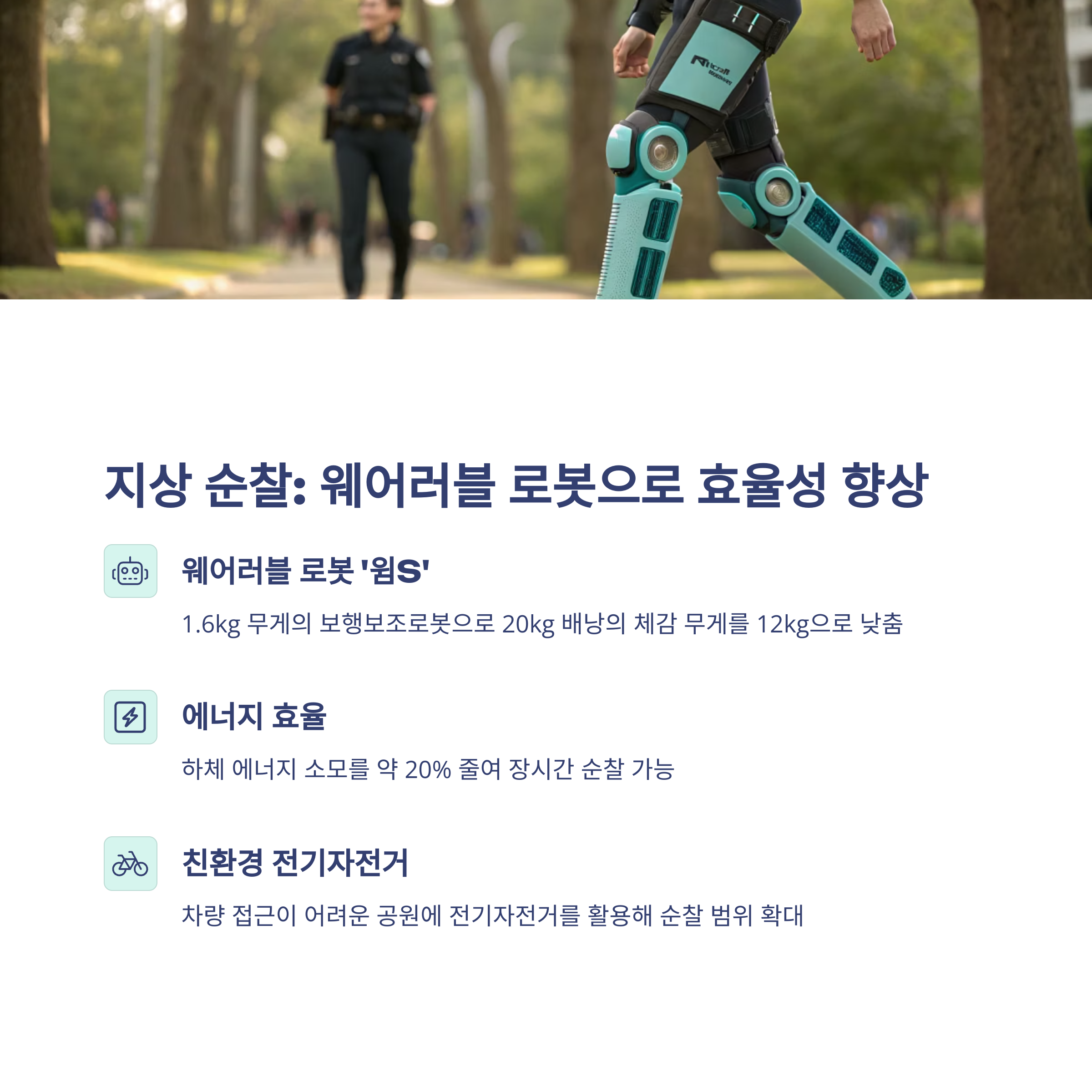 하체 보행을 보조하여 경찰이 장시간 걷거나 달릴 때 체력 소모를 줄이고 기동성을 높이는 데 큰 역할을 합니다.