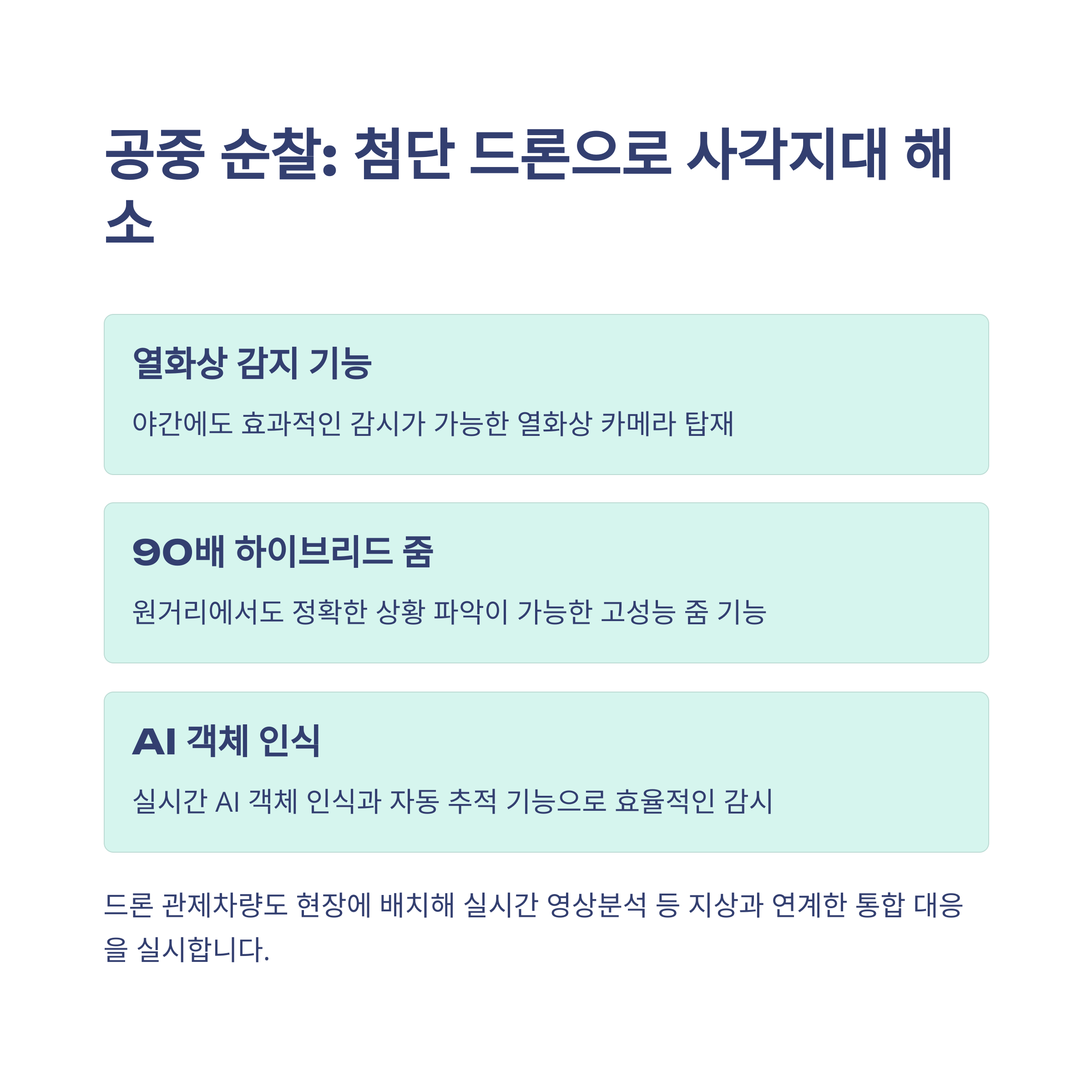 90배 줌 카메라, 열화상 감지, AI 객체 인식으로 사각지대 감시 및 실시간 통합 대응이 가능합니다.