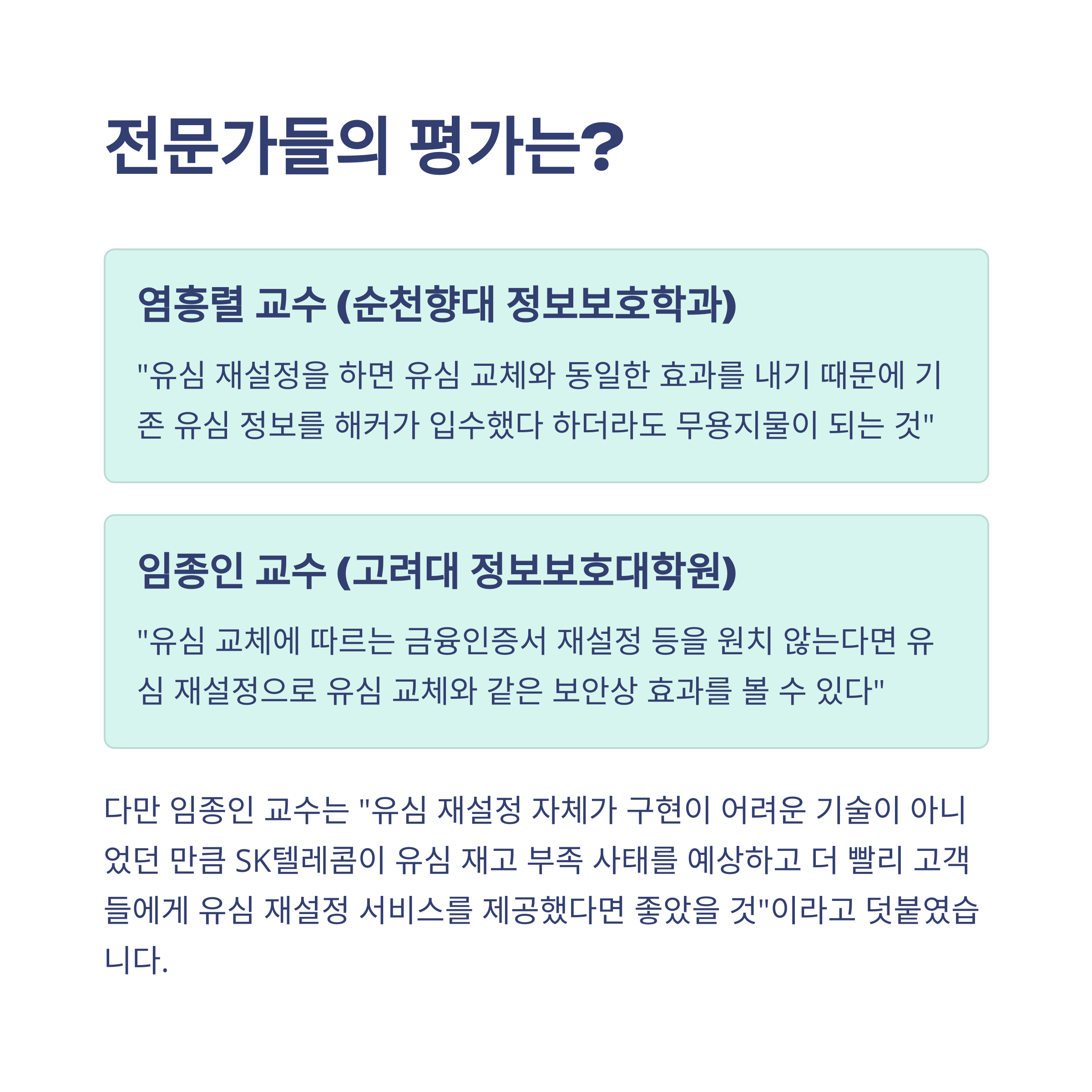 보안 전문가들 사이에서도 이번 SKT의 유심 재설정 서비스는 꽤 긍정적인 평가를 받고 있어요. 특히 유심 교체 없이도 동일한 보안 효과를 낼 수 있다는 점에서 "기술은 오래전부터 가능했지만, 이제서야 실행된 점은 아쉽다"는 목소리도 있었죠.