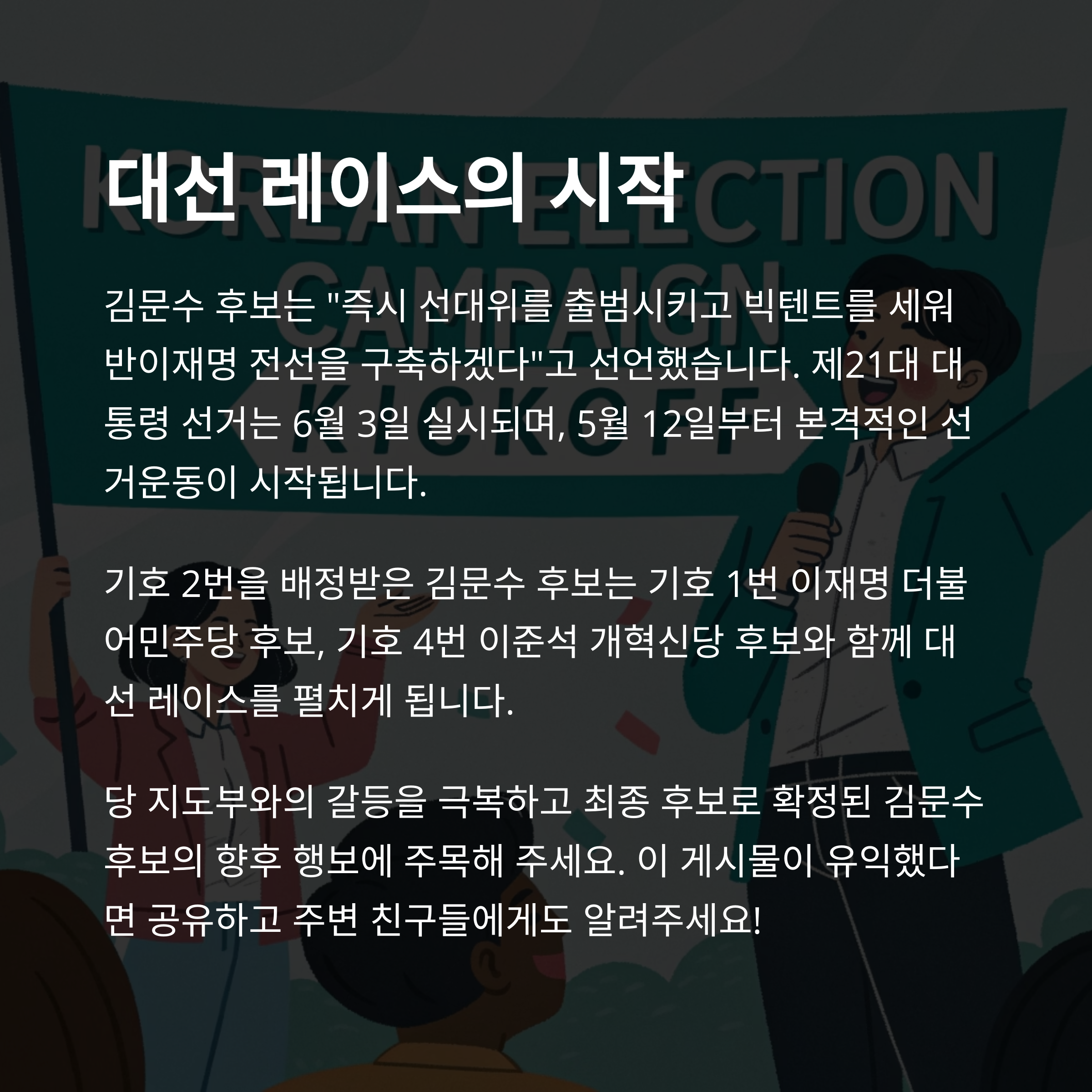 선거는 숫자의 게임이지만, 이번 대선은 감정과 서사의 대결로도 볼 수 있어요. 김문수 후보가 만들어갈 또 다른 반전, 여러분은 어떻게 예상하시나요?