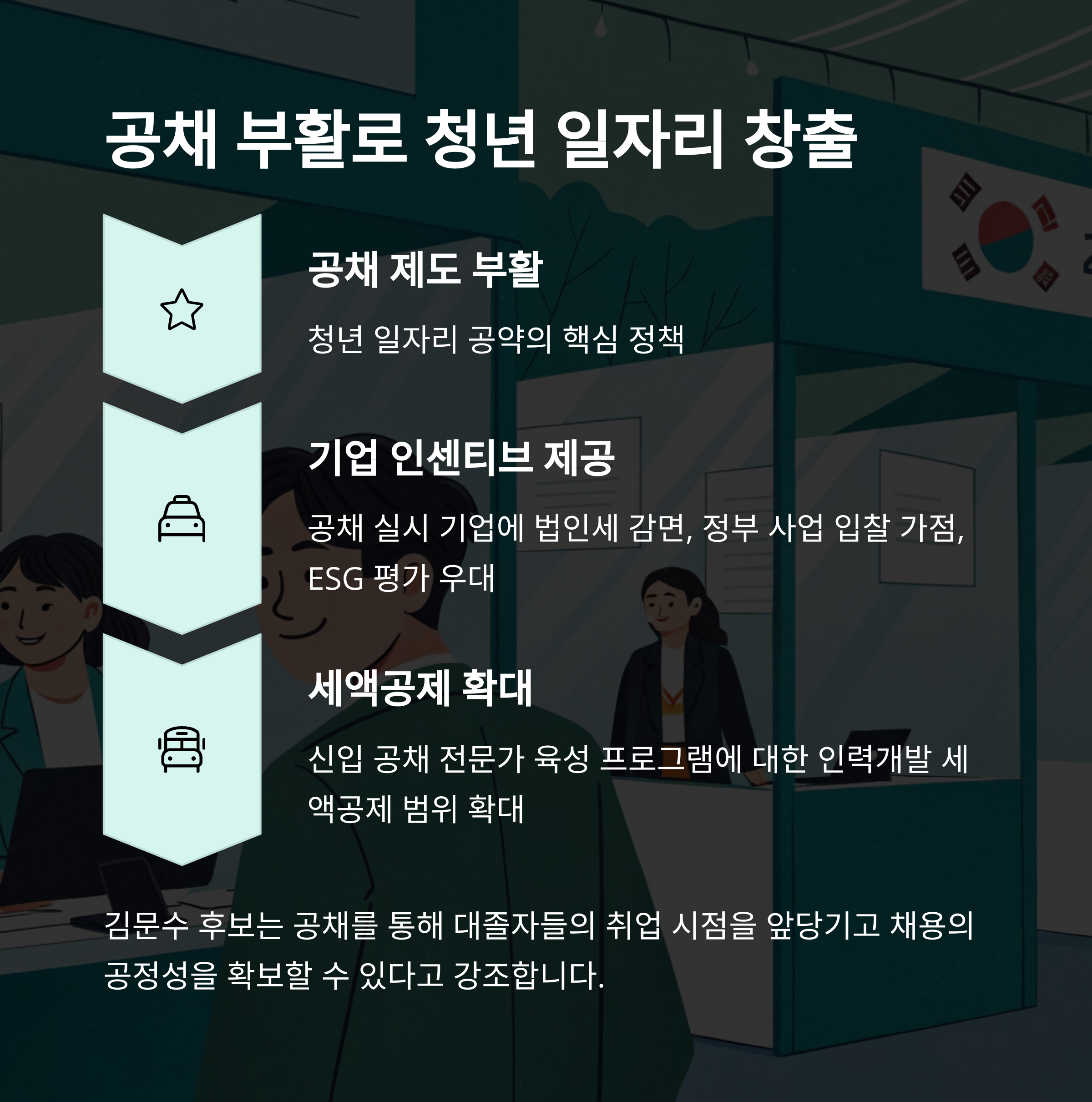공채 제도 부활, 공채 실시 기업 인센티브 제공, 청년 인력 개발에 대한 세액공제 확대 등이 있습니다.
