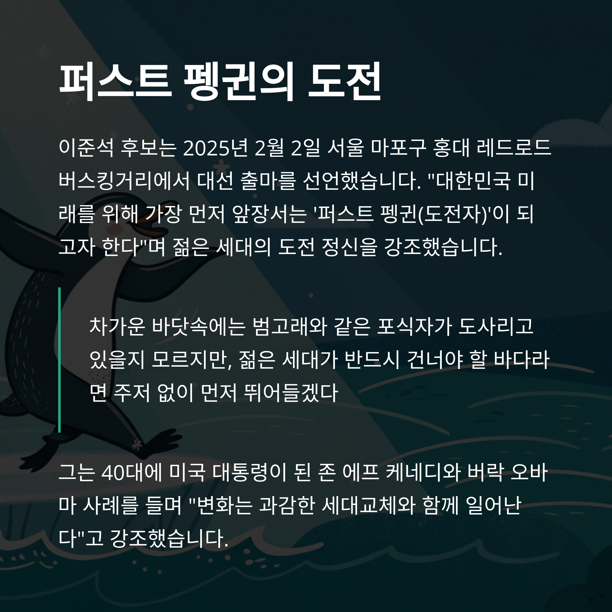 2025년 2월 2일, 서울 홍대 거리에서 기자회견을 연 이준석 후보는 "퍼스트 펭귄"이라는 표현으로 자신을 비유하며 대선 출마를 공식화했어요. 위험을 감수하더라도 젊은 세대의 미래를 위해 첫 발을 내딛겠다는 의지가 담긴 상징이었죠.