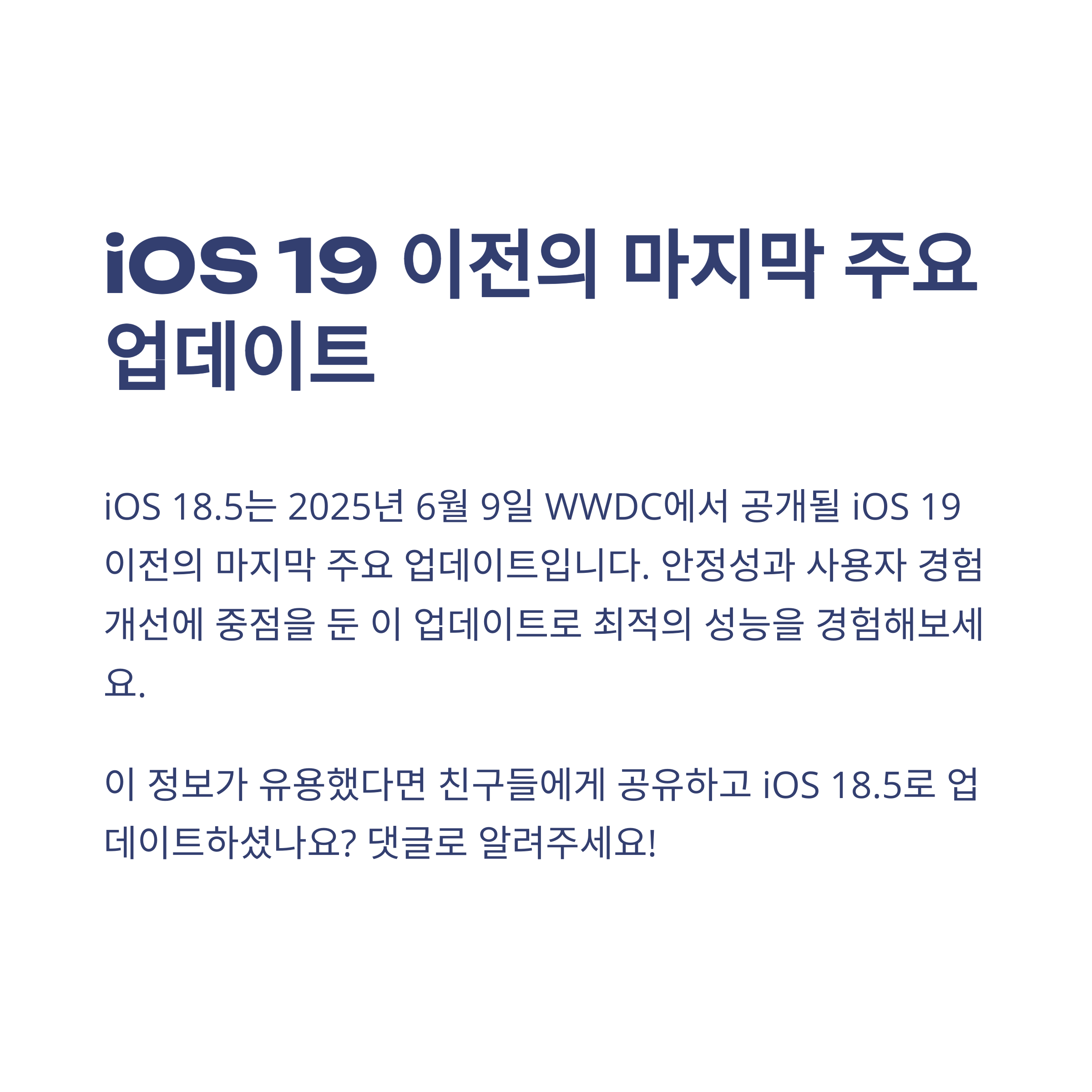 이렇게 보니 iOS 18.5는 단순한 버그 수정 업데이트가 아니죠? 사용자 경험을 섬세하게 개선하면서도, 보안성과 기능성을 동시에 잡은 ‘알짜 업데이트’라고 할 수 있어요. 아직 업데이트 안 하셨다면, 지금 바로 설정 앱을 열어보세요. 이미 해보셨다면 어떤 기능이 가장 마음에 들었는지도 궁금하네요! 댓글로 여러분의 의견과 체험을 나눠주세요. 그리고 이 글이 도움이 되셨다면 지인과 공유해주시는 것도 잊지 마시고요!