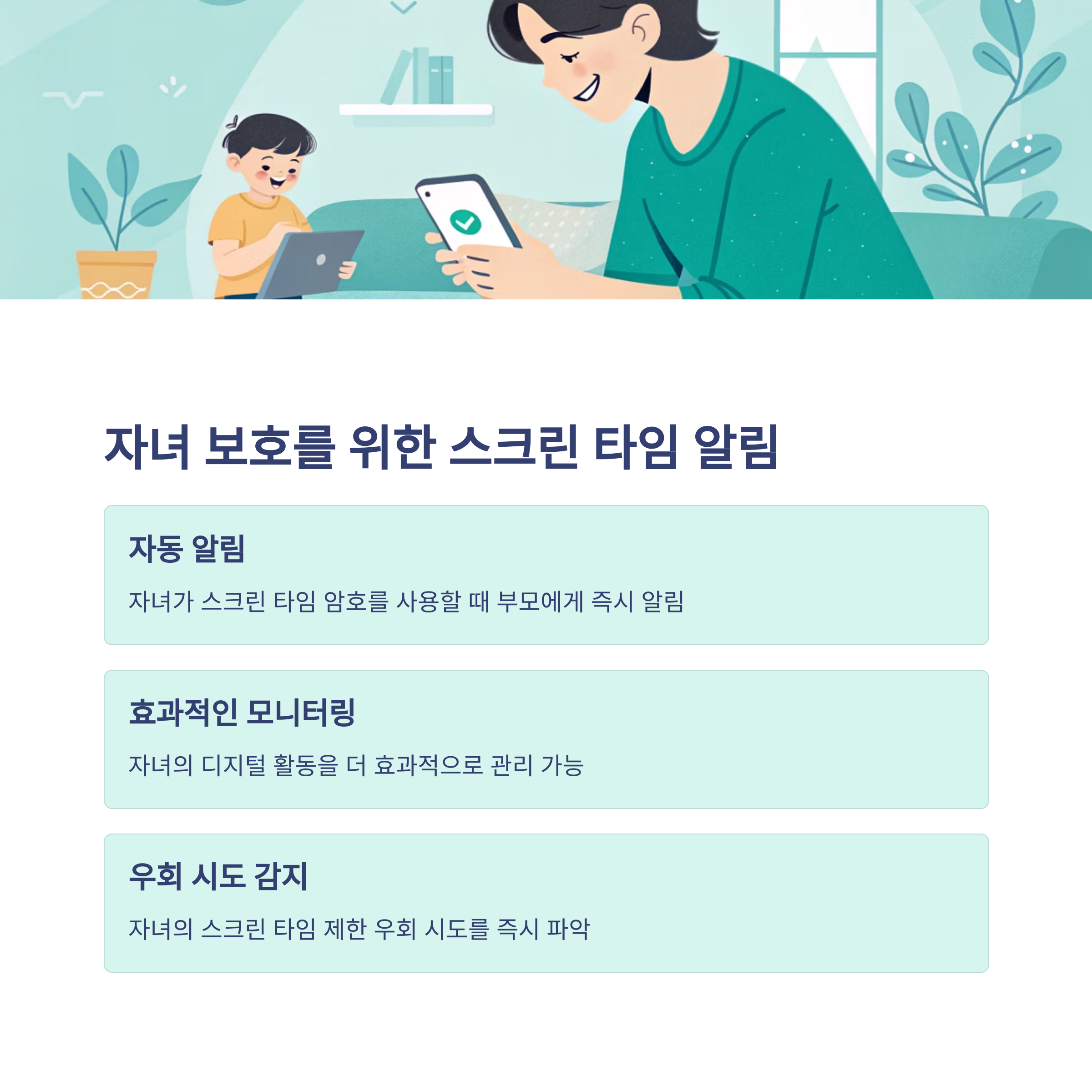 | 스크린 타임 암호 입력 감지 | 자녀가 암호를 입력 시 즉시 부모에게 알림 전송 |