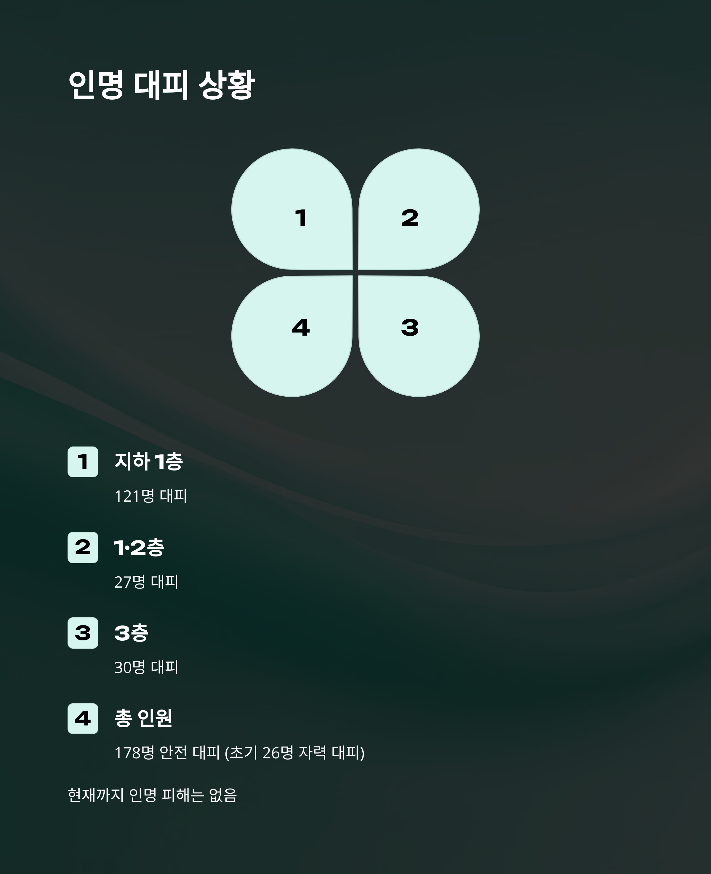 다행히 이번 화재에서는 단 한 명의 인명 피해도 발생하지 않았습니다. 처음 신고 후 불과 몇 분 만에 26명이 자력으로 탈출했고, 이어 총 178명의 직원이 전원 무사히 대피한 사실이 확인되었습니다. 각 층별 대피 인원은 다음과 같습니다: