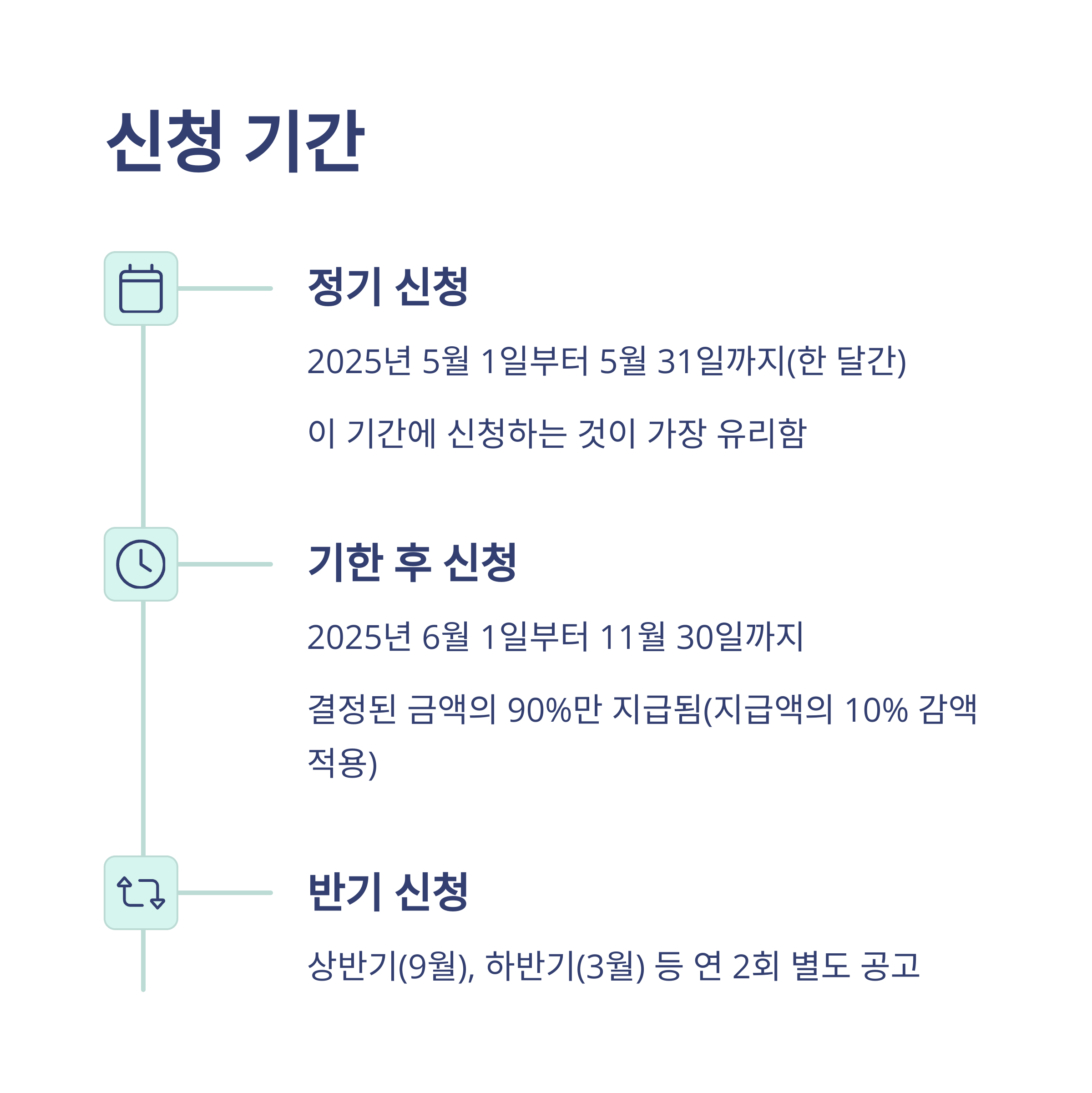 - 정기 신청: 5월 1일부터 31일까지. 가장 유리하며 전액 지급.