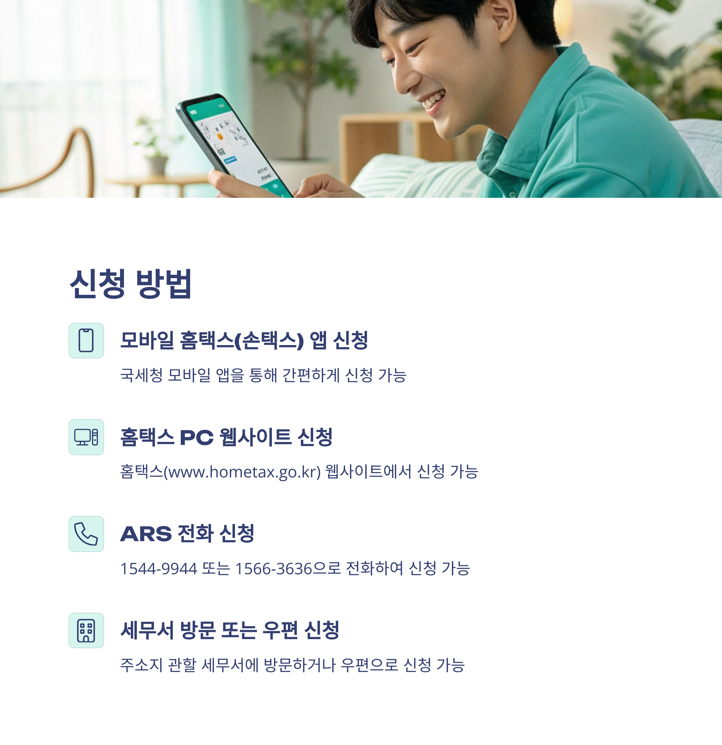예전엔 세무서를 직접 가야만 신청할 수 있었는데, 요즘은 정말 다양한 방법이 생겼어요. 모바일 앱부터 전화까지, 상황에 맞게 고를 수 있답니다.