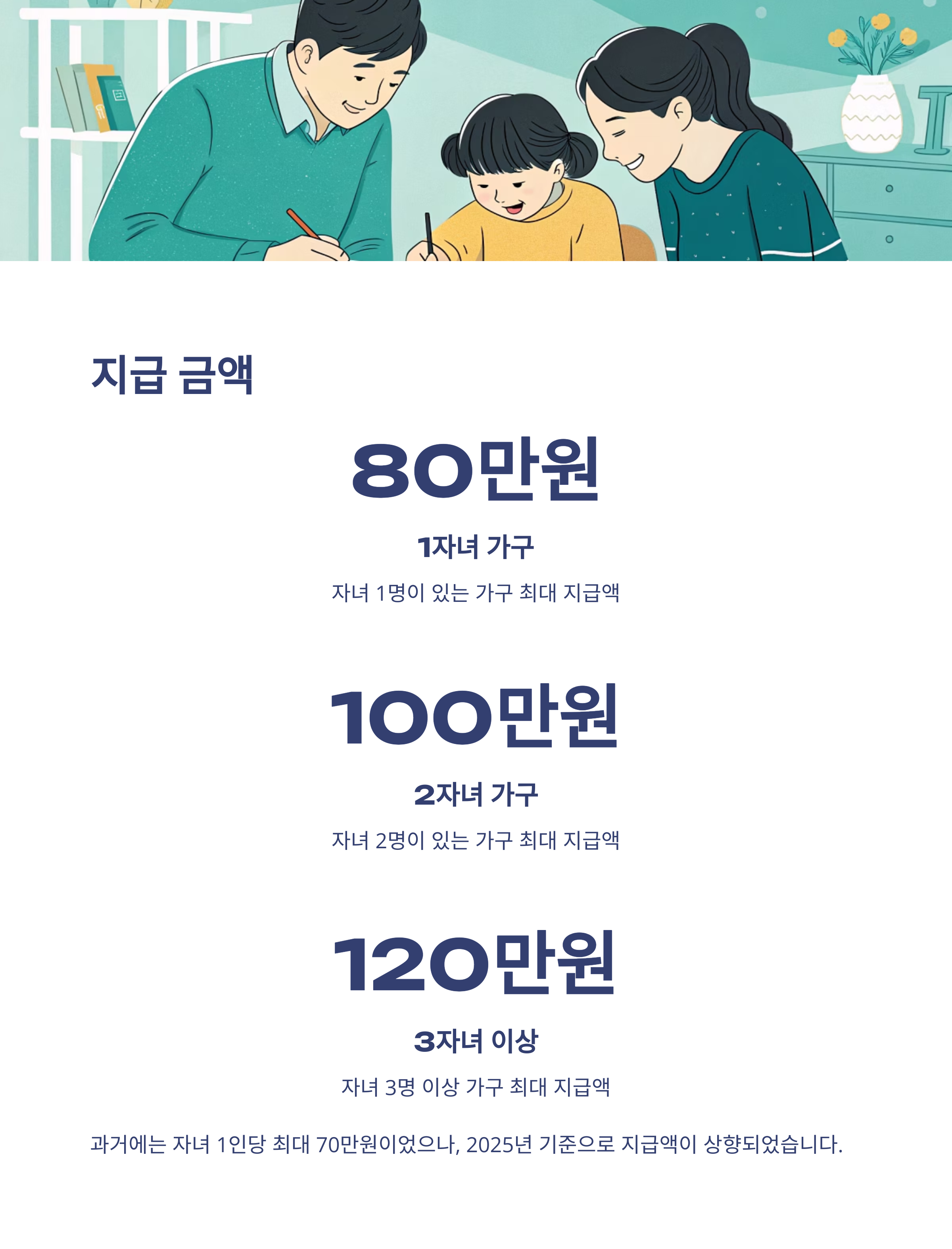 예전엔 자녀 1인당 70만 원이 최대였는데, 2025년부터는 자녀 수에 따라 한도가 올라갔어요. 특히 세 자녀 이상 가구는 무려 120만 원까지 받을 수 있다니, 이건 진짜 혜택이죠!