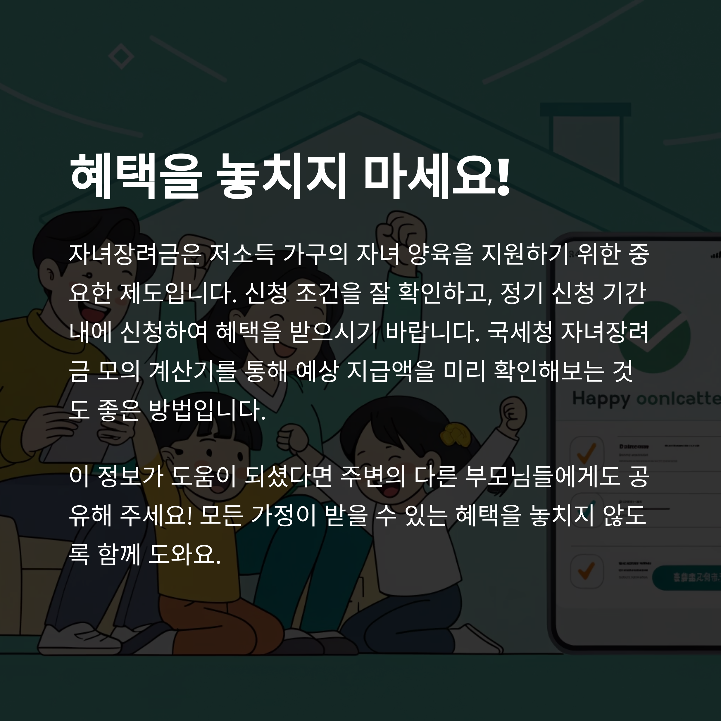 자녀장려금, 조건은 조금 까다롭지만 제대로 알고 준비하면 꼭 받을 수 있는 혜택이에요. 특히 2025년엔 지원금도 늘고 신청 방법도 다양해졌으니, 늦기 전에 꼼꼼히 챙겨보세요! 혹시 주변에 이런 정보 잘 모르는 분이 있다면 함께 나눠주세요. 우리 모두 놓치지 말고 혜택 잘 챙기는 한 해 되었으면 좋겠어요 :)
