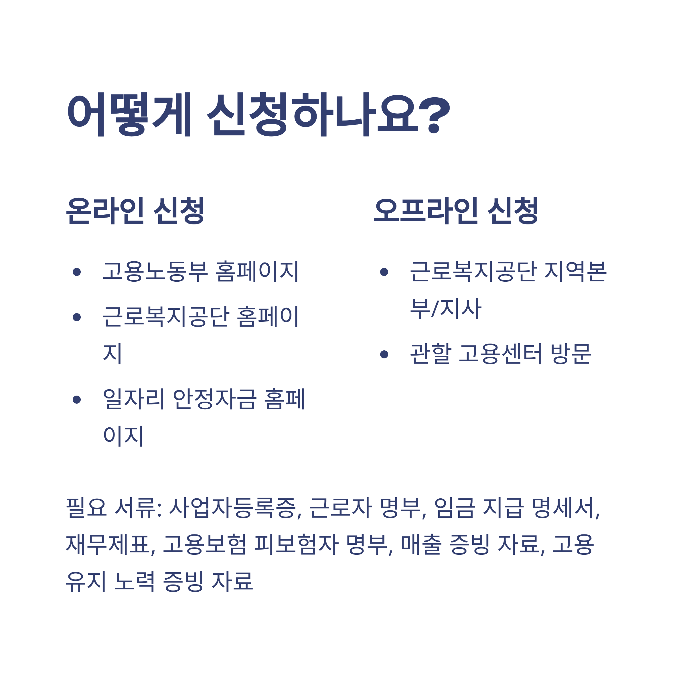 - 온라인: 고용노동부, 근로복지공단, 일자리안정자금 홈페이지 중 택1