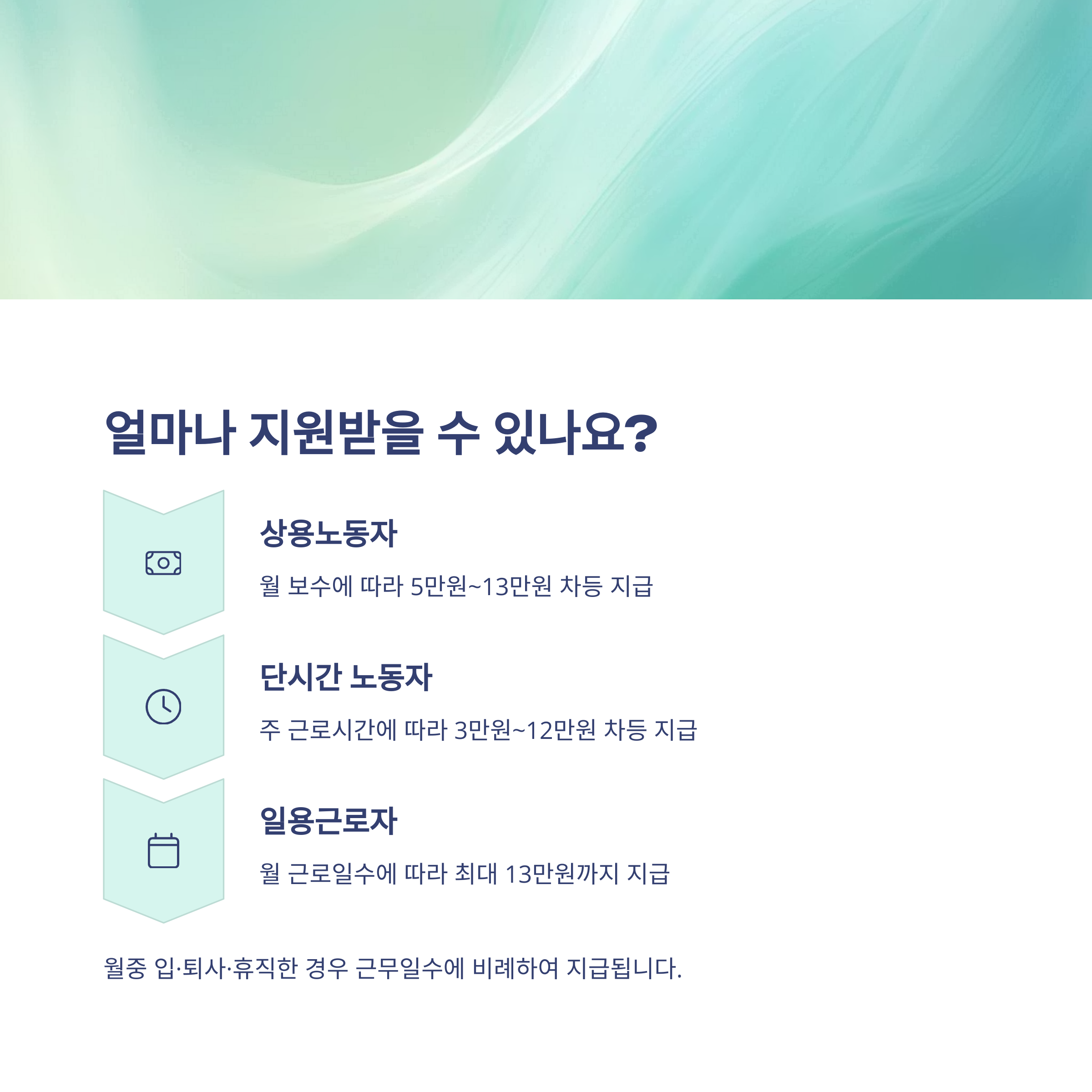 지원금은 근로자의 형태나 급여에 따라 달라져요. 상용, 단시간, 일용근로자별로 금액이 다르니까 아래 표를 꼭 확인해 보세요.
