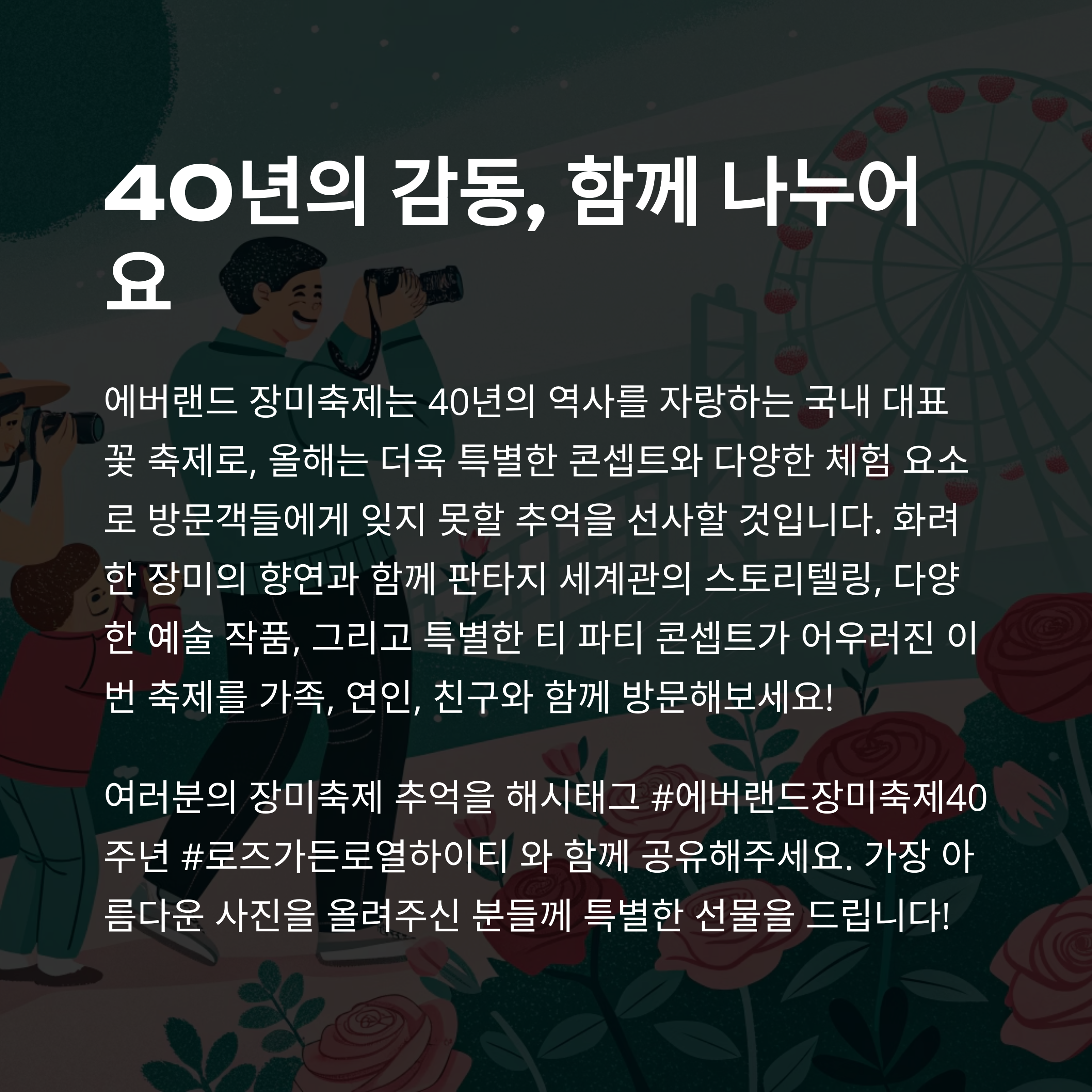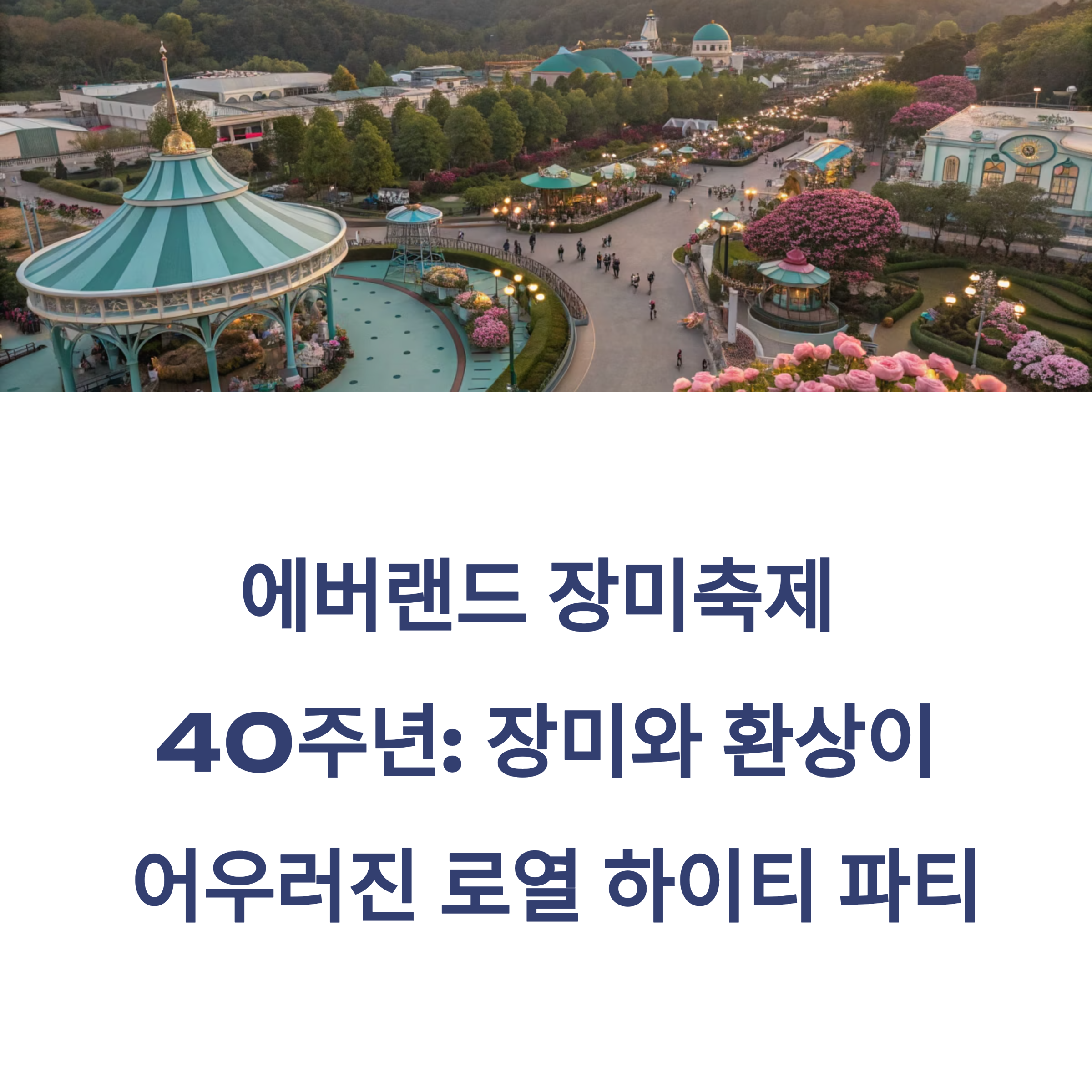 안녕하세요, 꽃을 사랑하는 모든 이들에게 소식을 전하고 싶은 마음으로 글을 씁니다. 매년 5월이면 마음이 설레곤 했죠. 그 이유는 바로 에버랜드의 장미축제 때문인데요, 올해는 그 장미축제가 무려 40주년을 맞이한다고 해요. 작년에 친구와 장미원에서 사진을 찍고, 로즈 아이스크림을 나눠먹었던 추억이 아직도 생생하거든요. 그런데 올해는 이전과는 완전히 다른 콘셉트로 돌아왔다는 소식을 듣고 벌써부터 기대가 한가득이에요. 새로운 캐릭터, 새로운 이야기, 그리고 300만 송이의 장미라니...! 자, 그럼 저와 함께 이번 장미축제의 모든 매력을 샅샅이 들여다보러 가실래요?