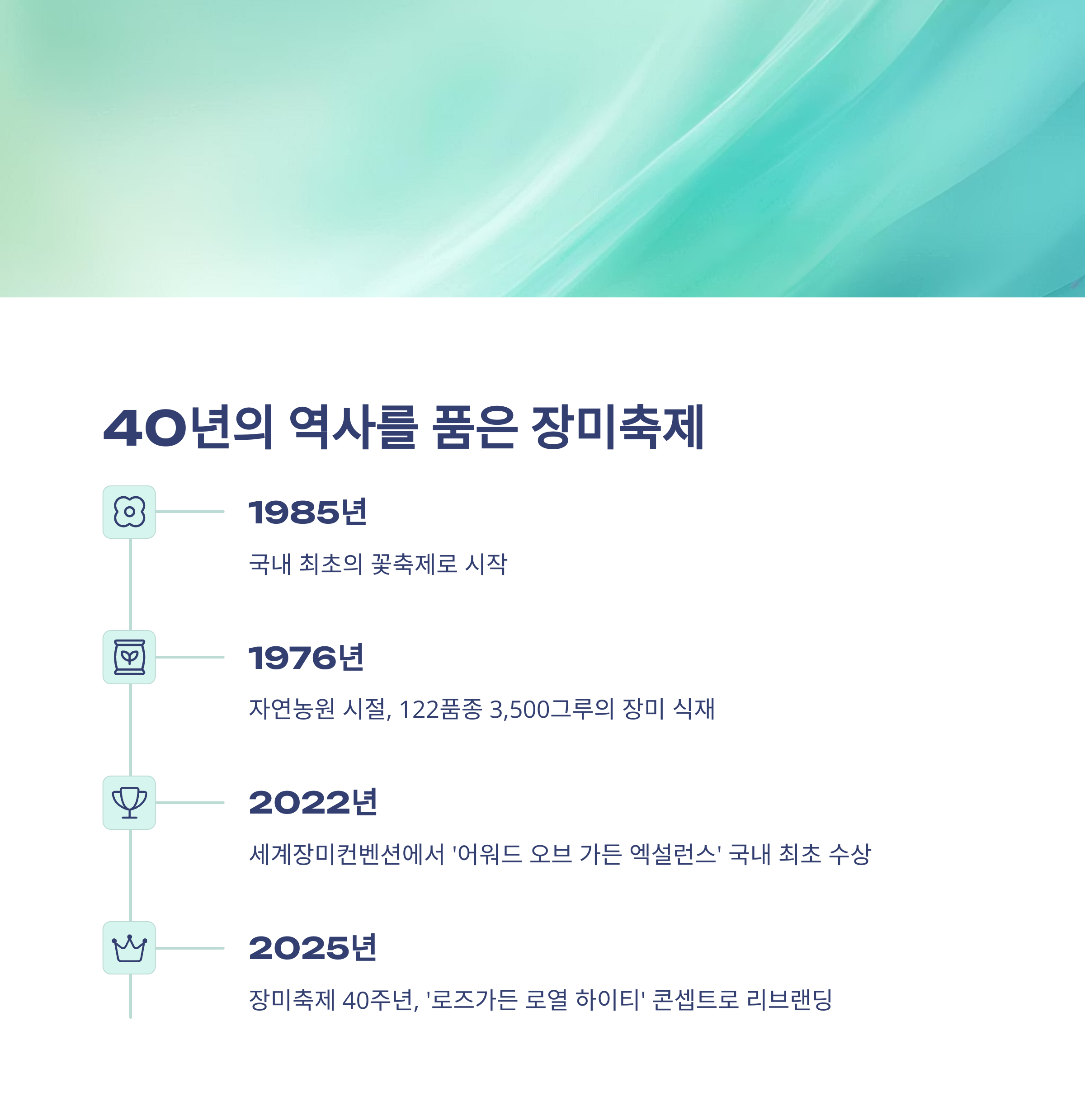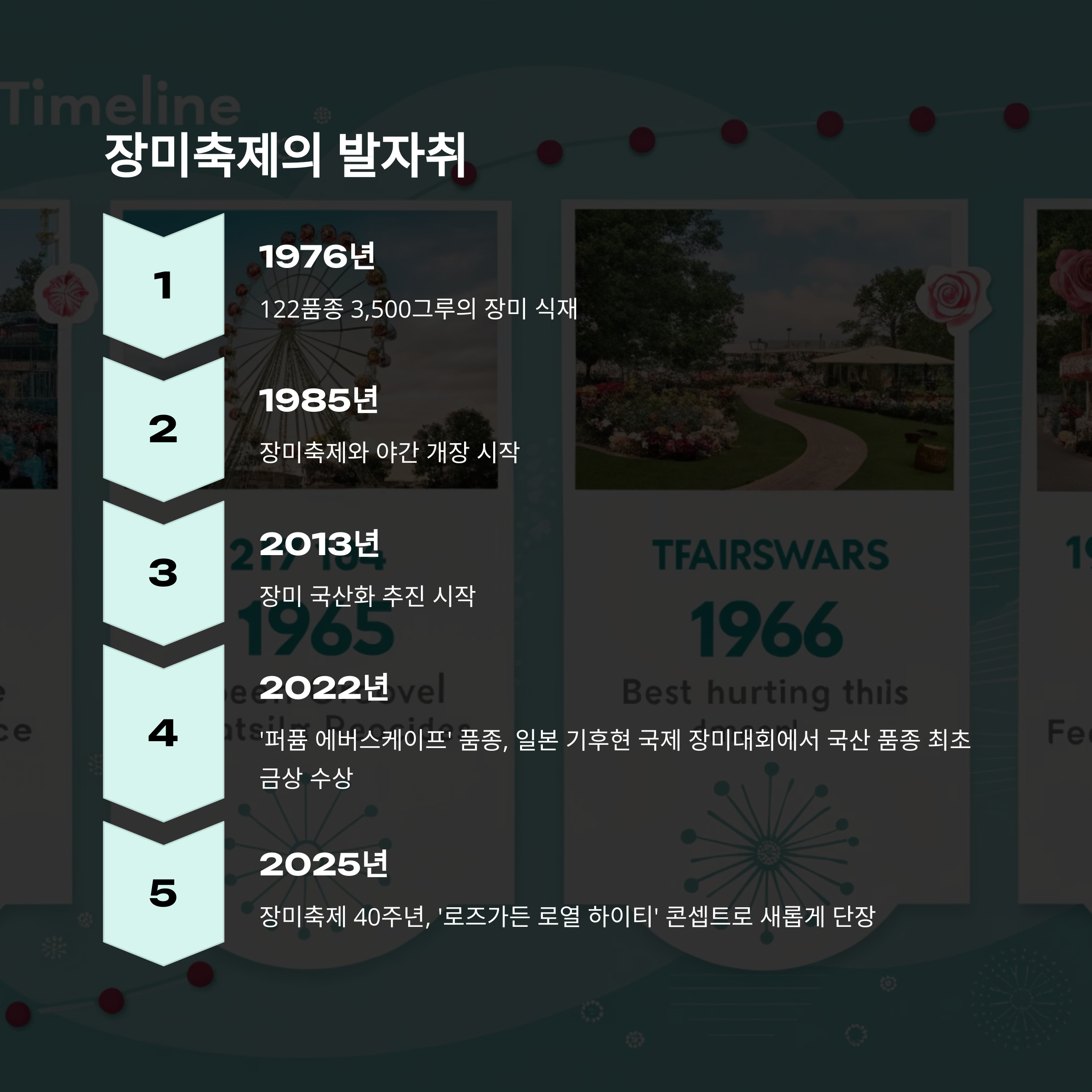 이후 1985년 정식 장미축제 출범, 2013년 장미 국산화 사업 착수, 2022년 세계 장미 대회 수상, 그리고 2025년 로로티 콘셉트로 리브랜딩까지… 이제는 한국을 대표하는 꽃 축제가 되었답니다.