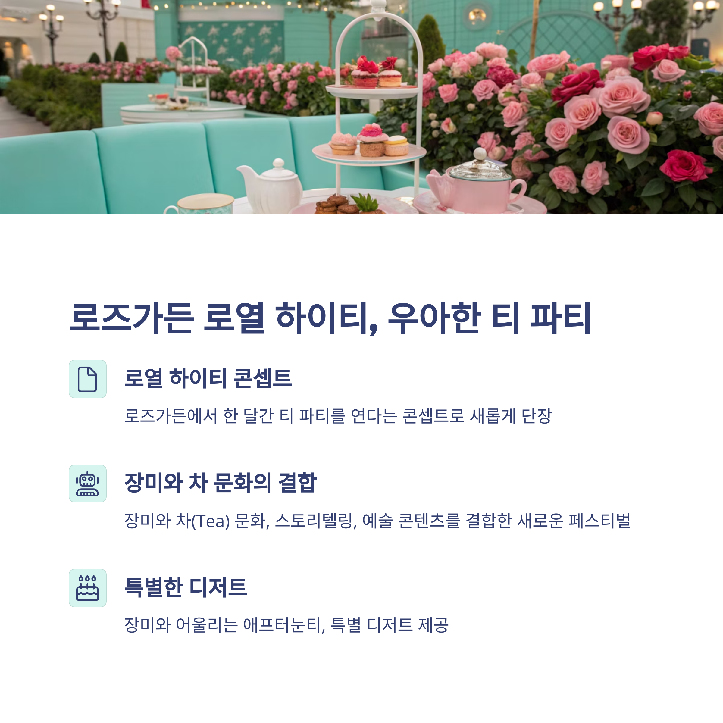 올해의 키워드는 '로로티', 로즈가든 로열 하이티입니다. 말 그대로, 장미 정원에서 티 파티를 여는 콘셉트예요. 단순한 꽃 전시를 넘어, 차 문화, 스토리, 예술이 결합된 다층적인 경험을 선사하죠.