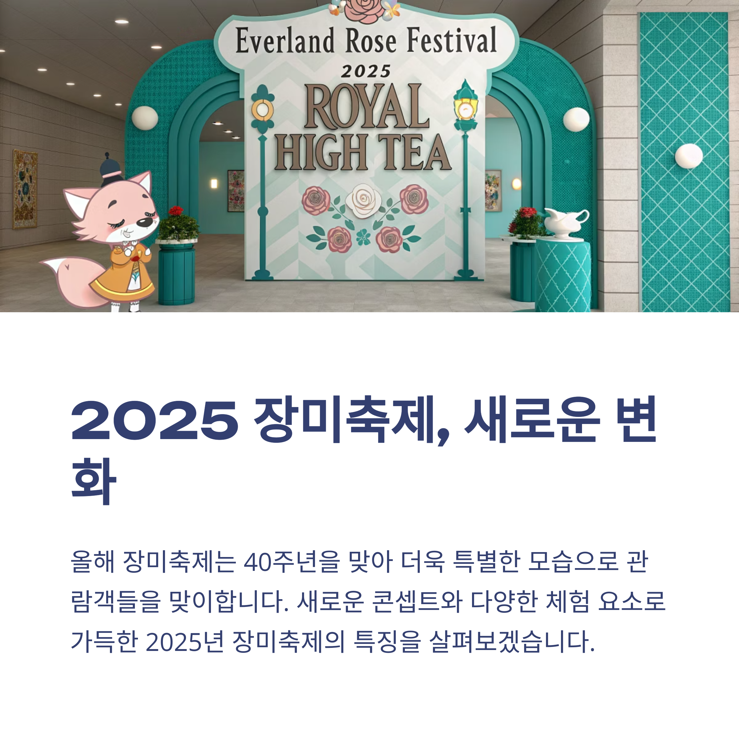 장미는 언제 봐도 예쁘지만, 축제를 통해 만나면 또 다른 감동을 줍니다. 특히 40주년을 맞은 에버랜드 장미축제는 단순한 꽃 전시를 넘어, 감성적인 이야기와 예술, 향기, 그리고 체험이 어우러지는 진정한 '꽃의 향연'이었어요. 올해 새로운 콘셉트인 '로즈가든 로열 하이티'는 평범한 나들이를 특별한 하루로 바꿔주기에 충분했습니다.