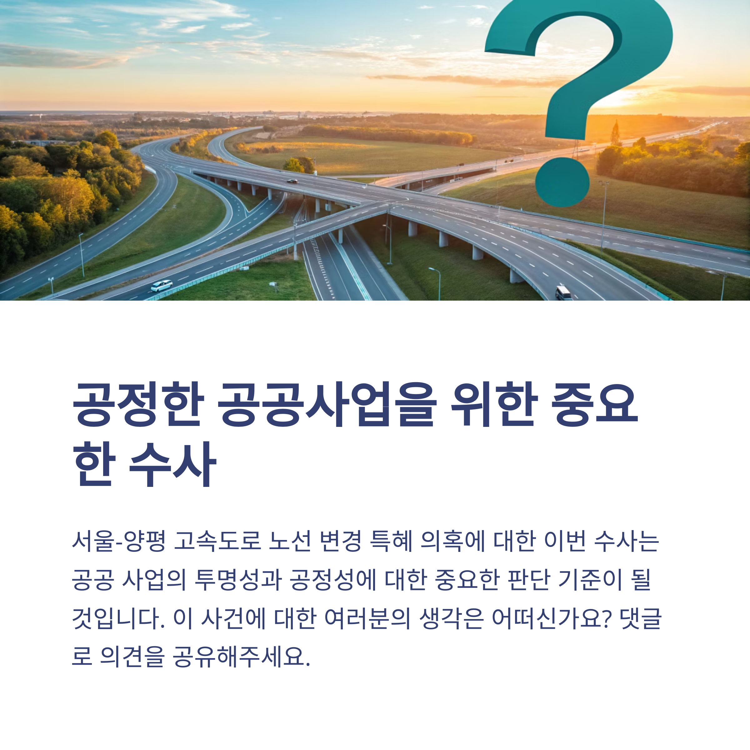 이번 수사는 서울-양평 고속도로뿐 아니라 향후 대형 국책사업의 투명성과 신뢰성까지 좌우할 수 있다는 점에서 중요한 의미를 갖습니다.