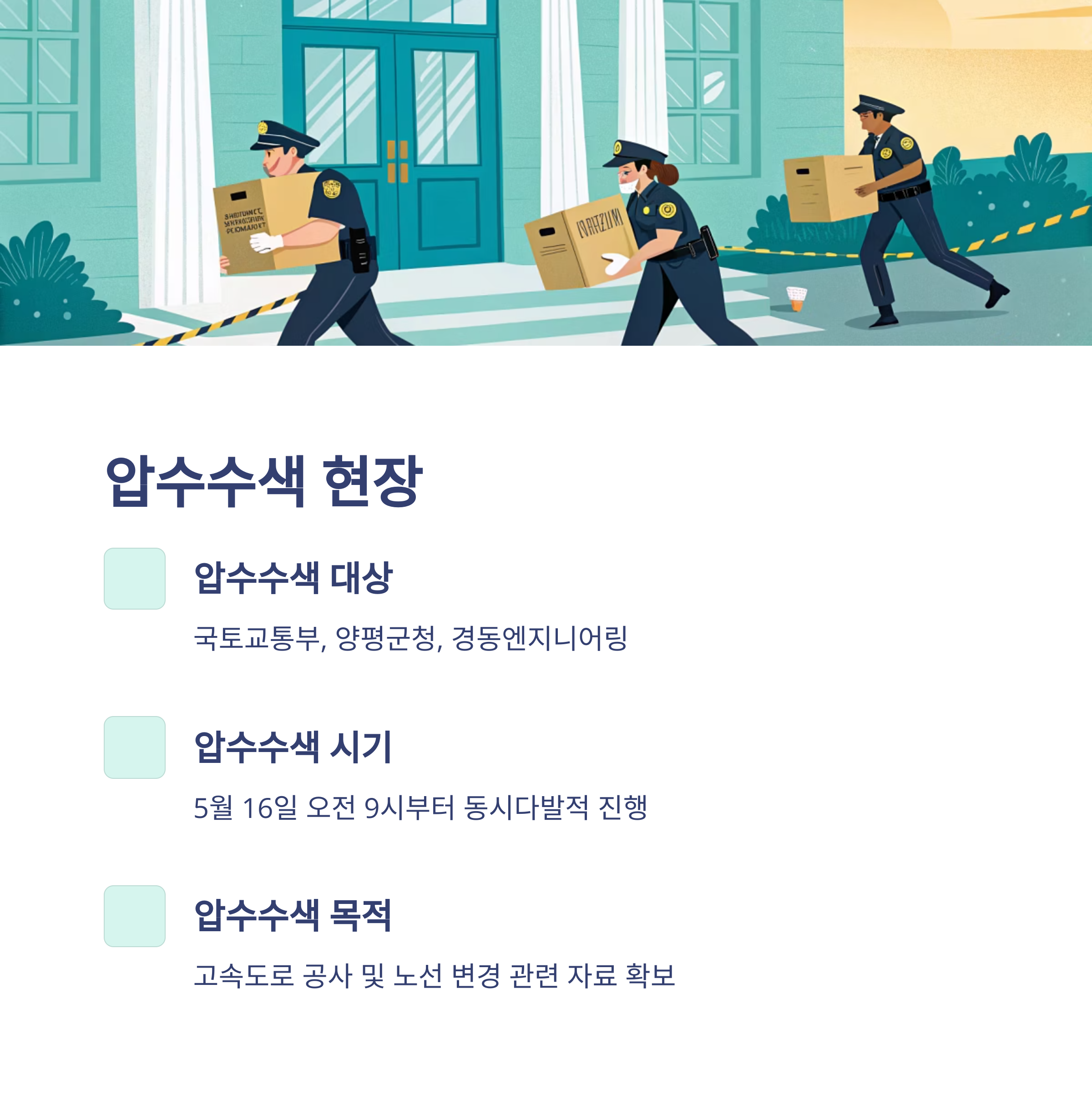 2025년 5월 16일 오전 9시, 경기남부경찰청 반부패·경제범죄수사대가 전격적으로 움직였습니다. 국토교통부, 양평군청, 그리고 타당성 조사 용역을 맡았던 경동엔지니어링에 대해 동시다발적인 압수수색을 벌인 건데요. 그간 뒷말만 무성했던 양평고속도로 특혜 의혹 수사가 본격적으로 시작된 셈이죠.