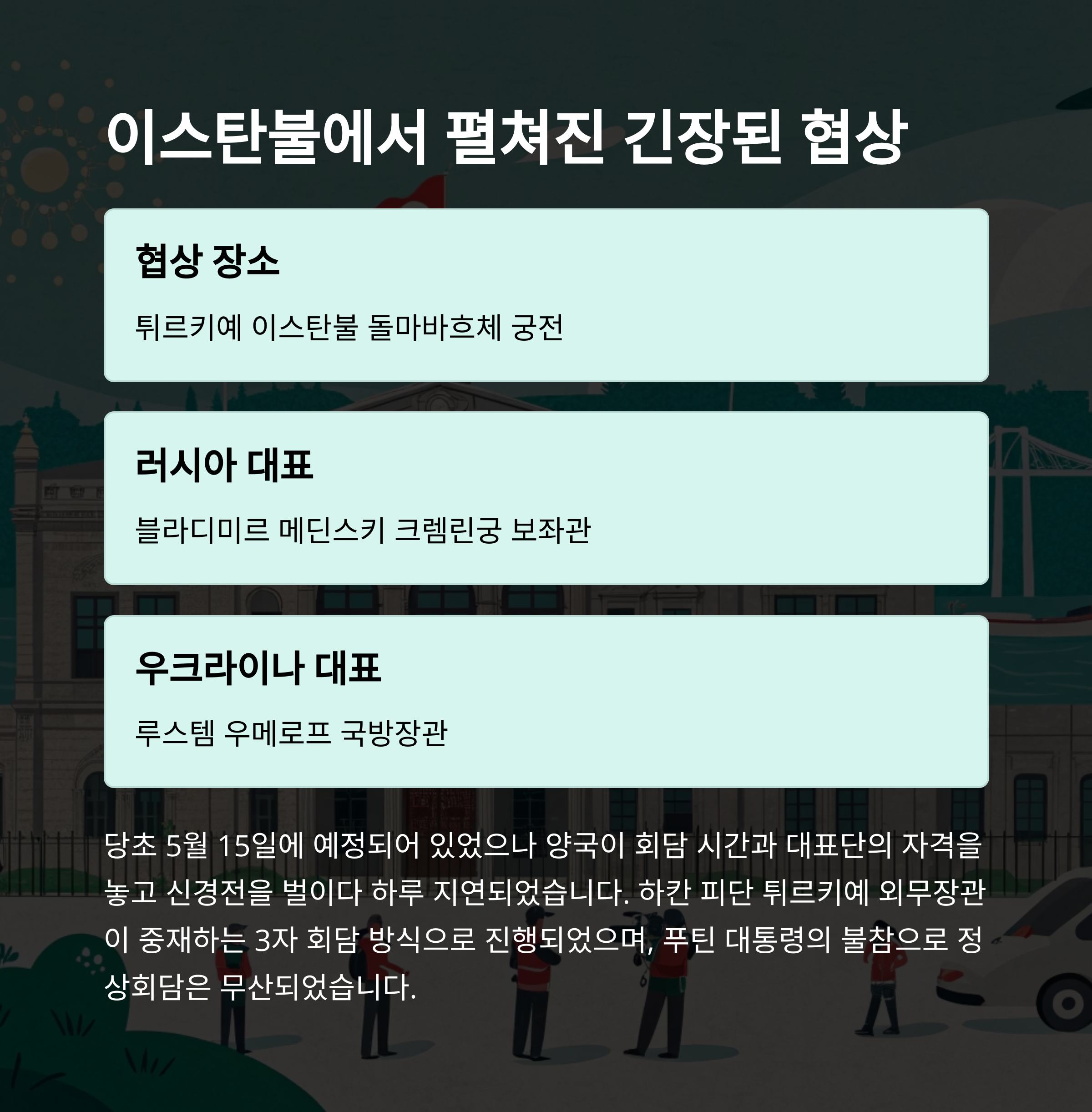 2025년 5월 16일, 튀르키예 이스탄불. 돌마바흐체 궁전에서 3년 만에 러시아와 우크라이나가 마주 앉았습니다. 이 협상은 2022년 3월 마지막 회담 이후 처음이자, 극심한 갈등 속에서 열린 중요한 만남이었죠. 당초 5월 15일로 예정됐던 일정은 양국 간 신경전으로 하루 미뤄졌고, 결국 오후 1시 35분쯤 협상이 시작됐습니다. 수석대표로는 러시아의 블라디미르 메딘스키와 우크라이나의 루스템 우메로프가 참석했으며, 튀르키예 외무장관 하칸 피단이 중재자로 나섰습니다.