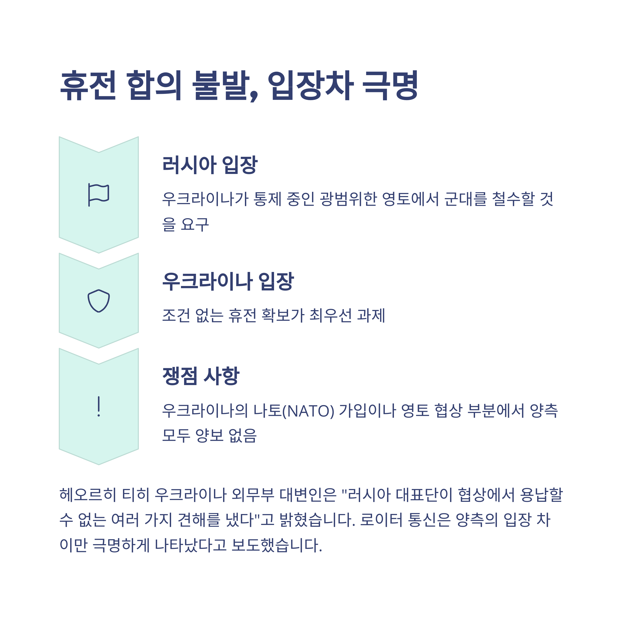 러시아가 우크라이나의 군 철수를 요구하고, 우크라이나는 이를 거절하면서 입장 차이가 컸기 때문입니다.